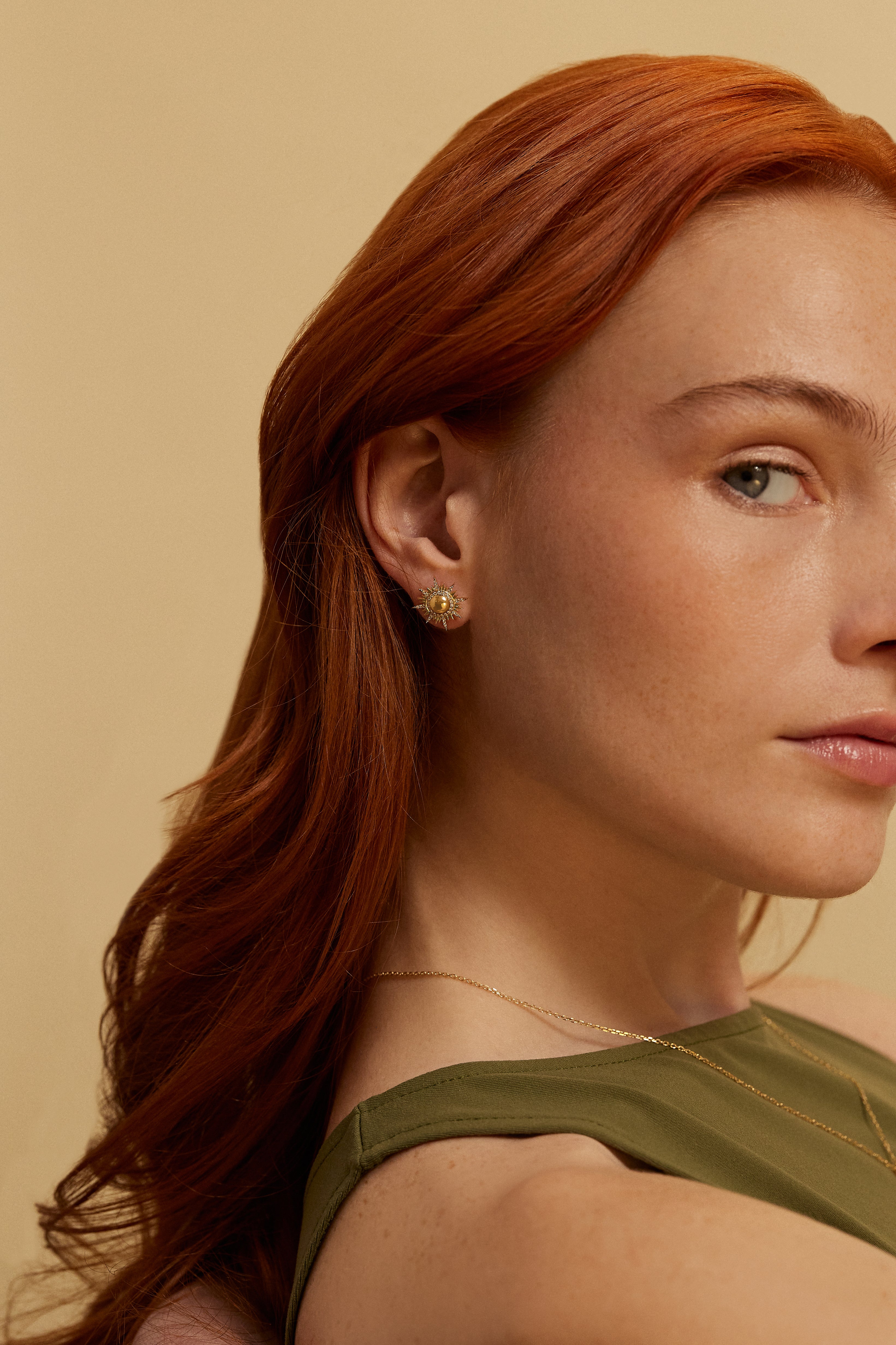 18K yellow gold sun studs with 0.17 cttw G-H/SI diamonds. 15 mm x 15 mm.