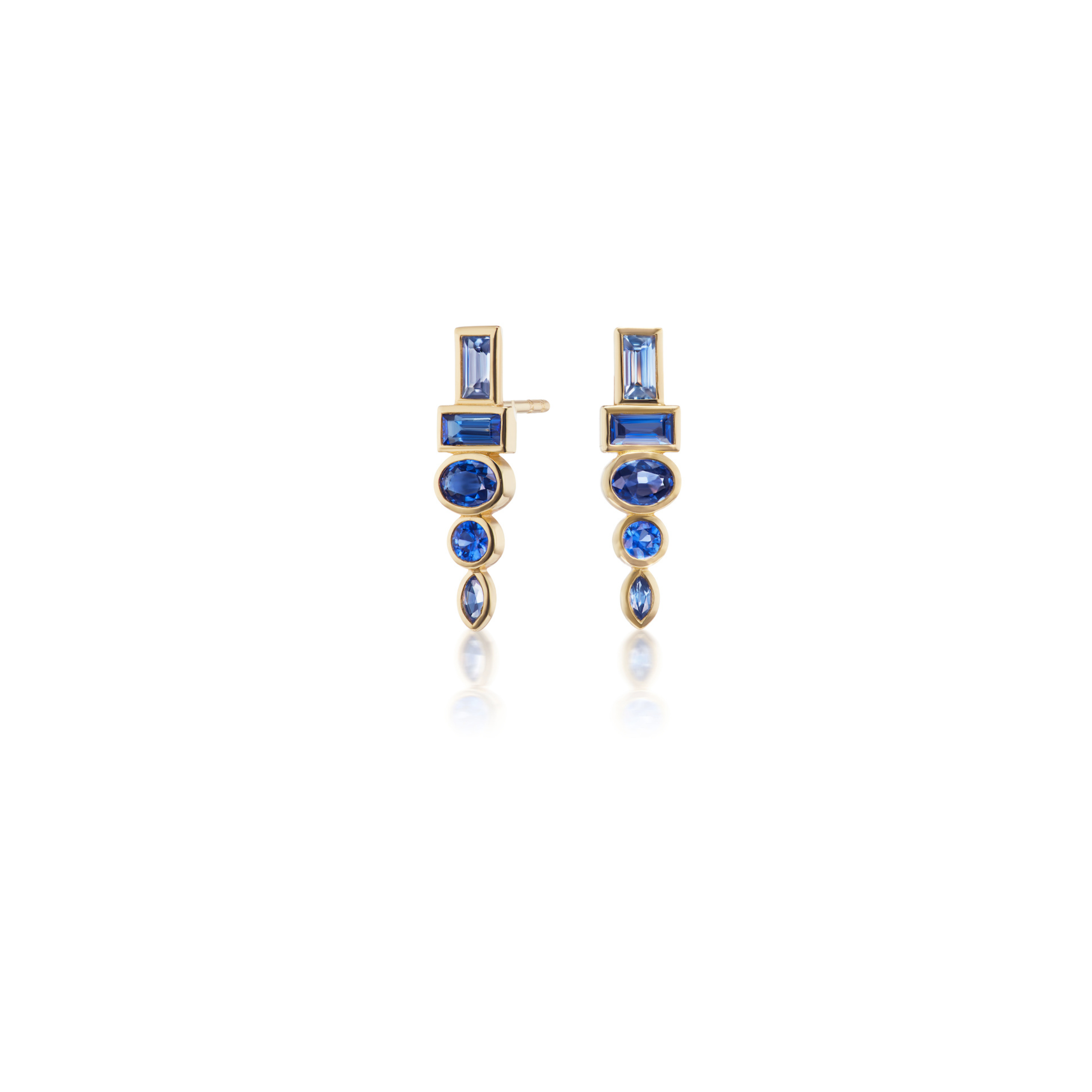 Handcrafted 18k yellow gold studs with 1.24 cttw blue sapphires custom-cut into our signature Monroe mixed shapes. 19 mm x 5 mm.