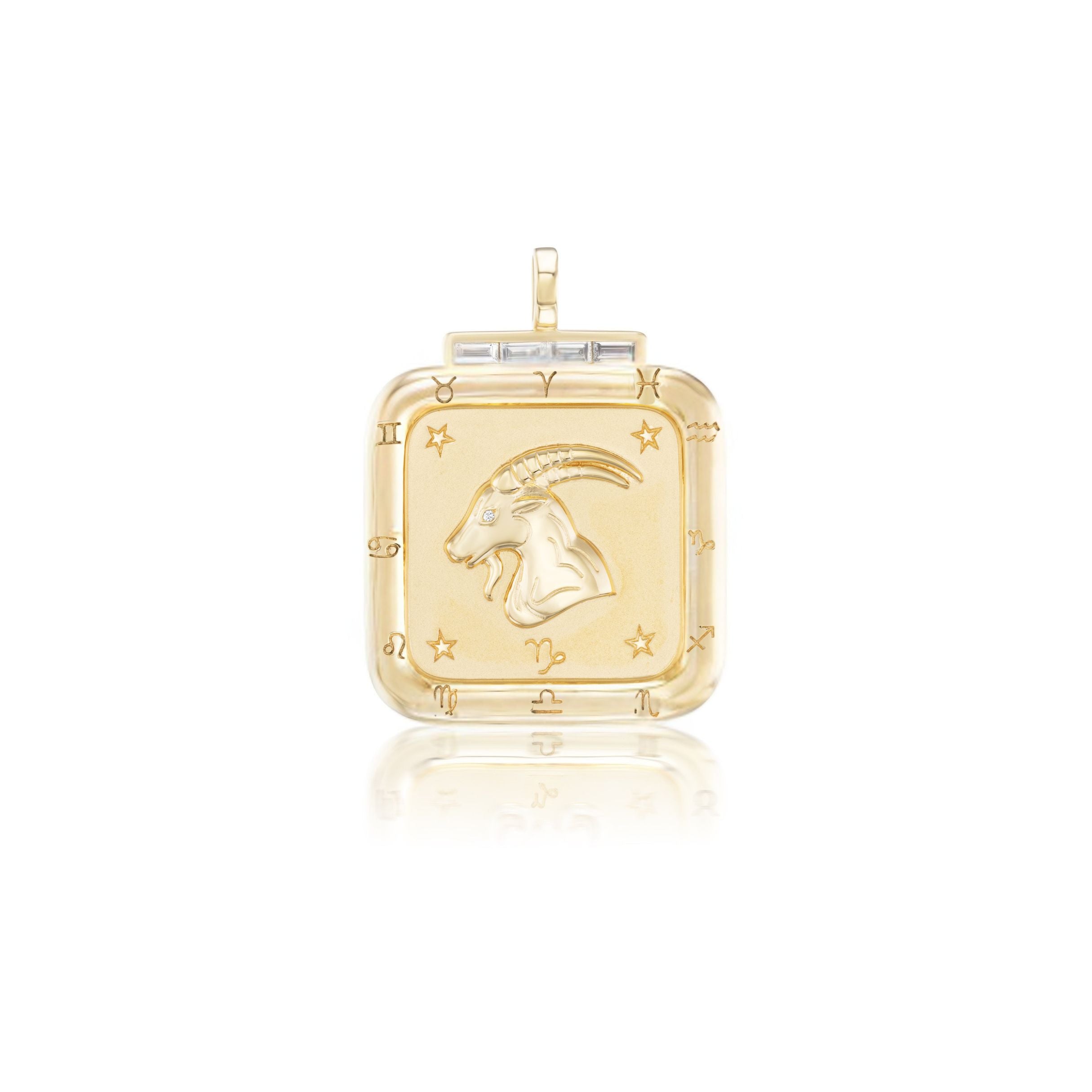 Handcrafted in 18k yellow gold with 0.22 cttw G-H/SI diamonds, this pendant features the sea goat, representing the Capricorn zodiac, pictured on the front. On the reverse, the magic continues with an engraved constellation, featuring diamonds in the place of stars, offering a subtle yet captivating representation of the night sky. This personal talisman invites you to carry both your astrological identity and the cosmic forces that shape your destiny.