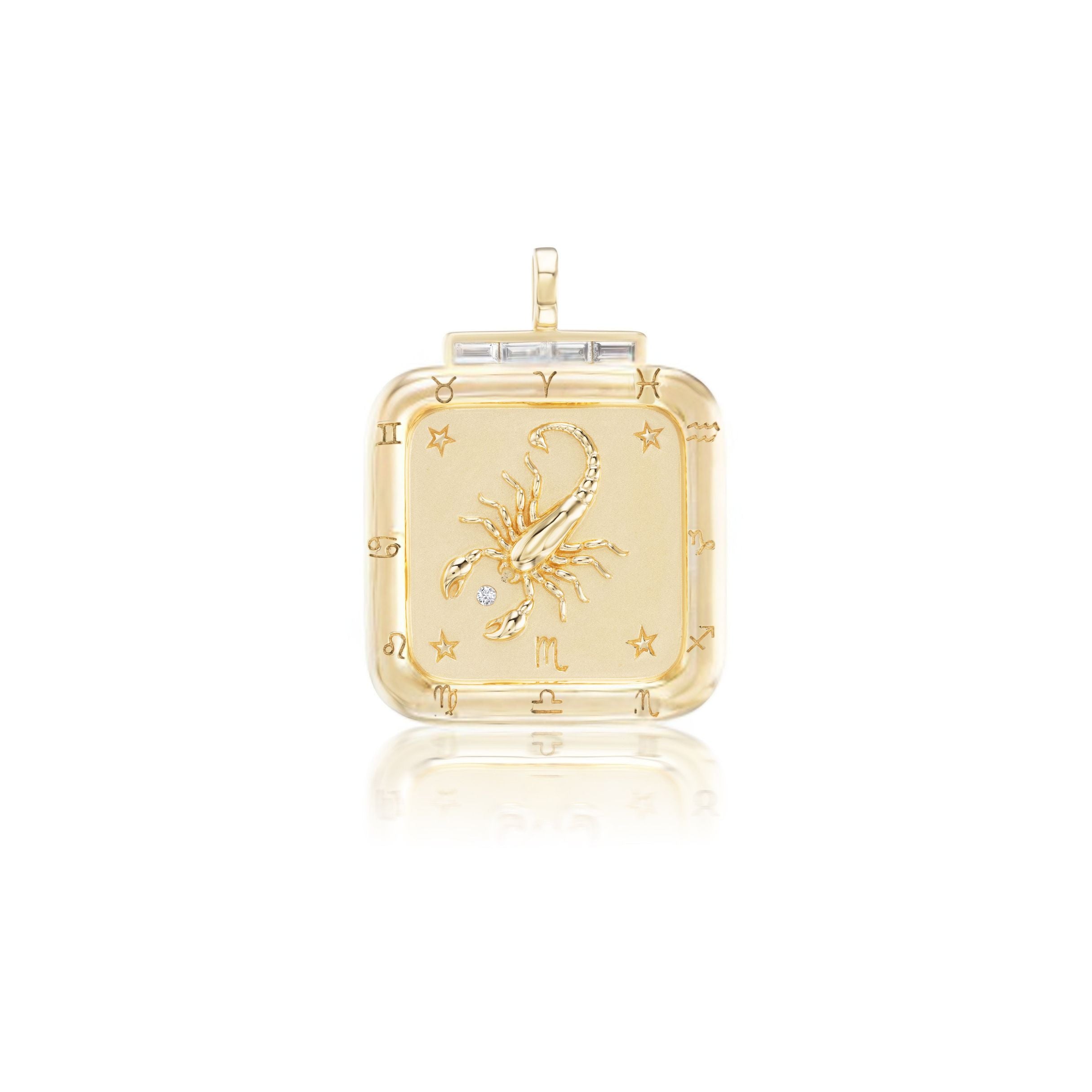 Handcrafted in 18k yellow gold with 0.21 cttw G-H/SI diamonds, this pendant features a scorpion, representing the Scorpio zodiac, pictured on the front. On the reverse, the magic continues with an engraved constellation, featuring diamonds in the place of stars, offering a subtle yet captivating representation of the night sky. This personal talisman invites you to carry both your astrological identity and the cosmic forces that shape your destiny.