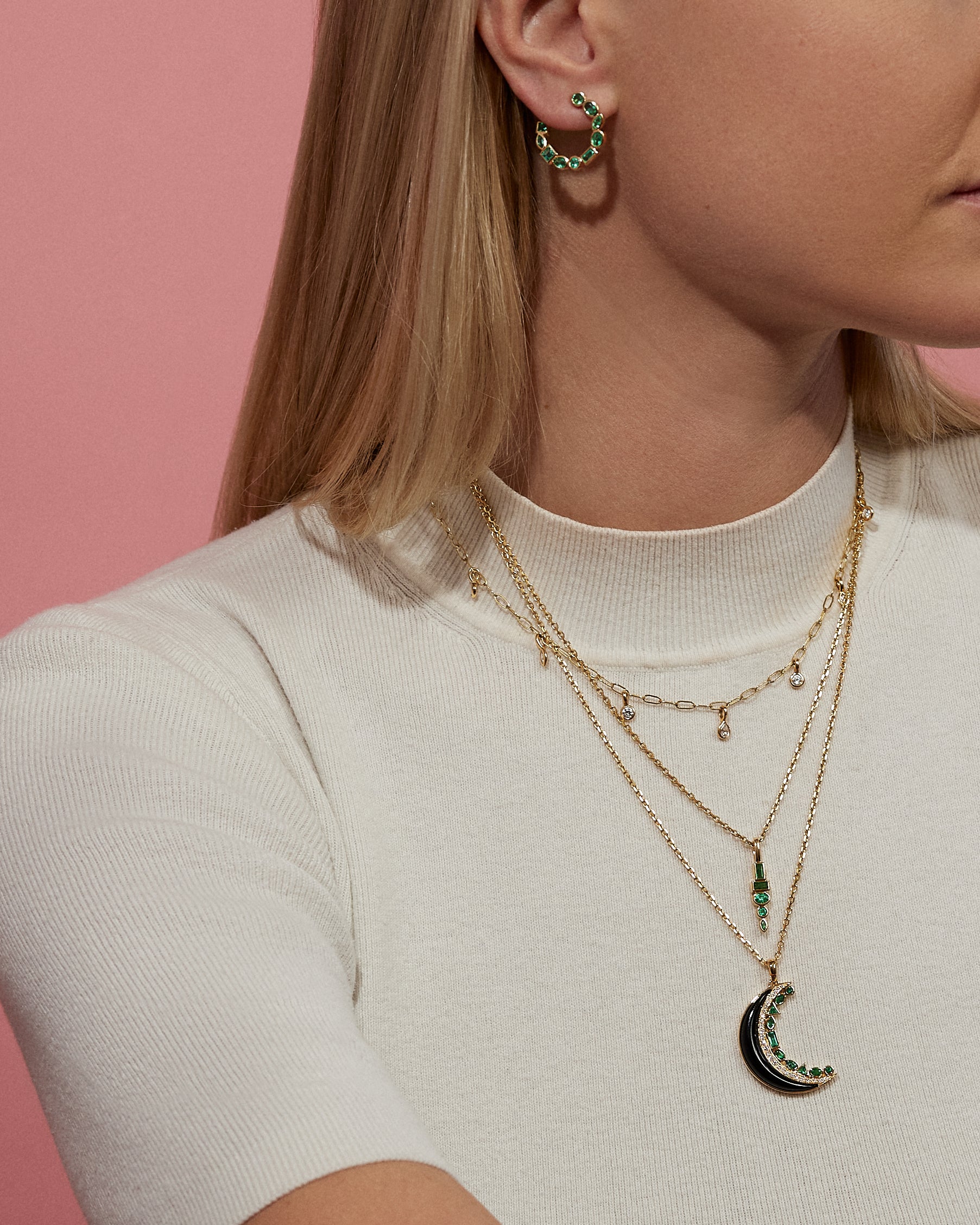 Handcrafted 18K yellow gold necklace with 1.00 cttw emeralds custom-cut into our signature Monroe mixed shapes. 18 inches.