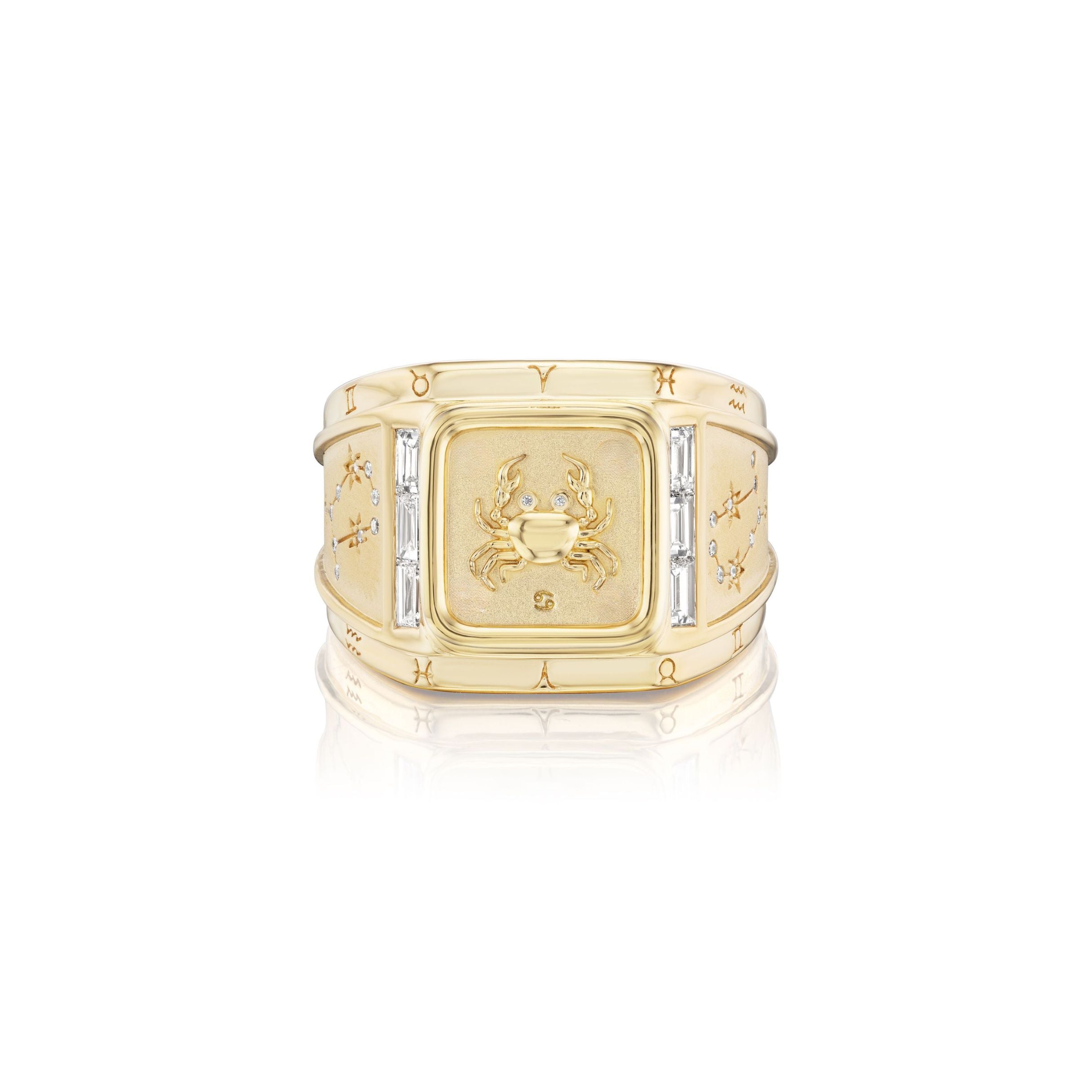 Handcrafted from 18k yellow gold with 0.35 cttw diamonds, this ring features a crab, representing the Cancer zodiac, pictured on the front. On the sides, the magic continues with an engraved constellation, featuring diamonds in the place of stars, offering a subtle yet captivating representation of the night sky. Around the border, all twelve zodiacs are represented, creating a complete cosmic narrative. This personal talisman invites you to carry both your astrological identity and the cosmic forces that shape your destiny.