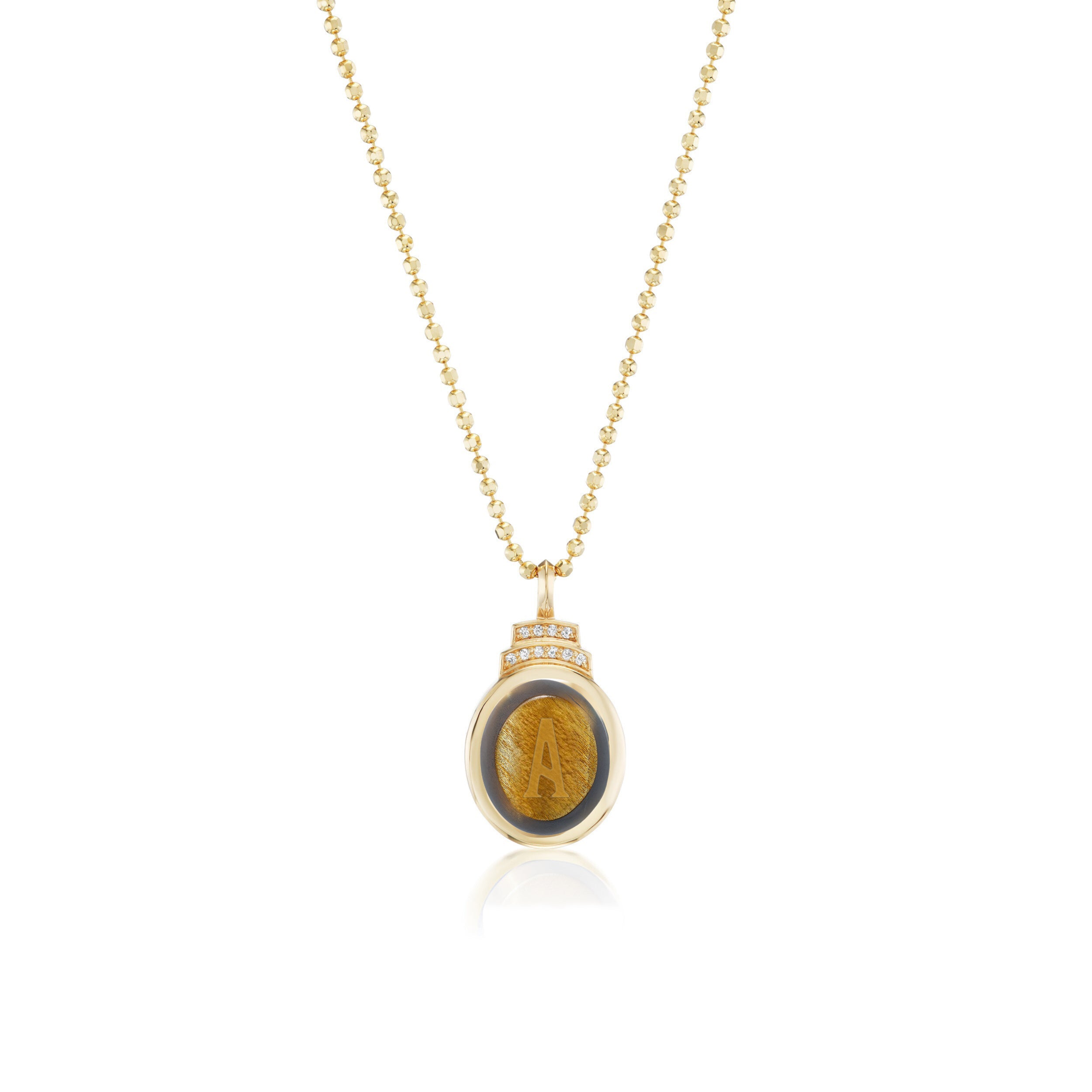 Our handcrafted 18k yellow gold engraved intaglio initial signet necklaces have been thoughtfully designed with 0.09 cttw G-H/SI diamonds and are able to be customized with eight distinct stones. Each pendant is meticulously hand-carved and transforms gold, stone, and diamonds into a wearable heirloom.