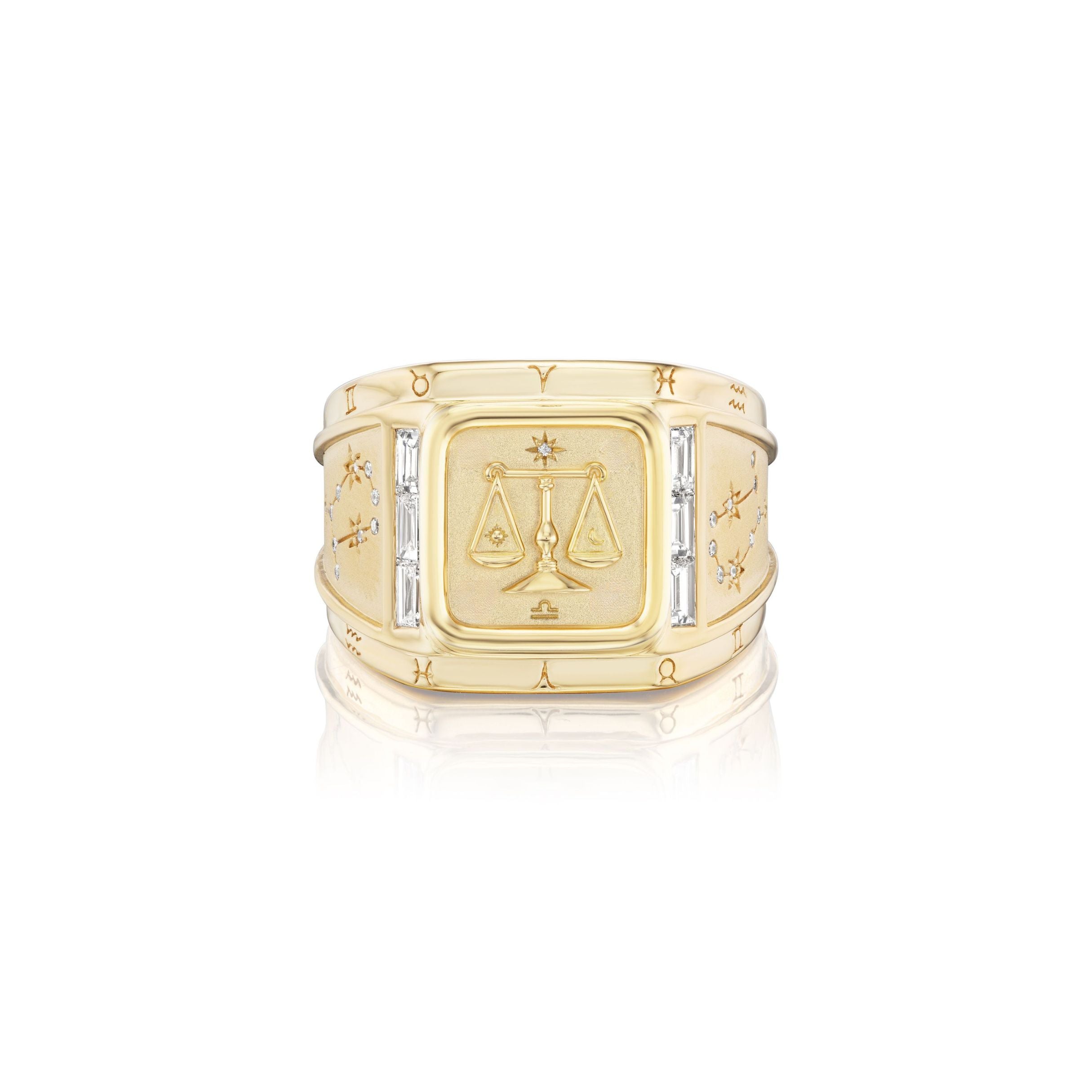 Handcrafted from 18k yellow gold with 0.35 cttw diamonds, this ring features scales, representing the Libra zodiac, pictured on the front. On the sides, the magic continues with an engraved constellation, featuring diamonds in the place of stars, offering a subtle yet captivating representation of the night sky. Around the border, all twelve zodiacs are represented, creating a complete cosmic narrative. This personal talisman invites you to carry both your astrological identity and the cosmic forces that shape your destiny.