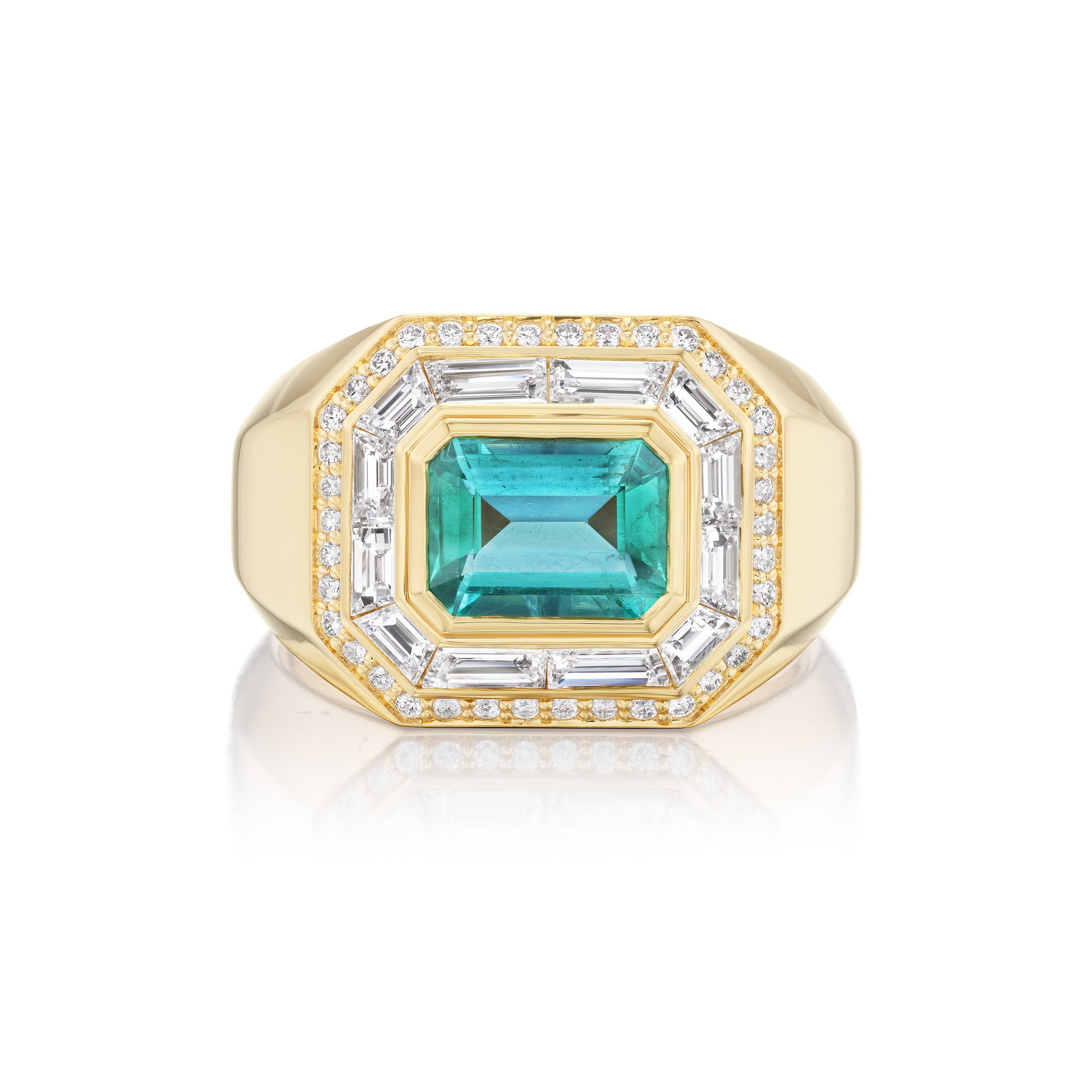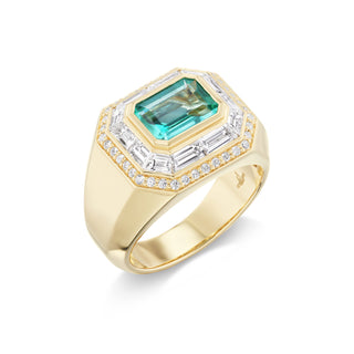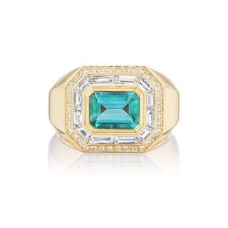 Handcrafted 18k yellow gold ring with 1.24 ctw Brazilian emerald and 1.30 cttw G-H/SI diamonds. 15 mm x 13 mm. Size 6.