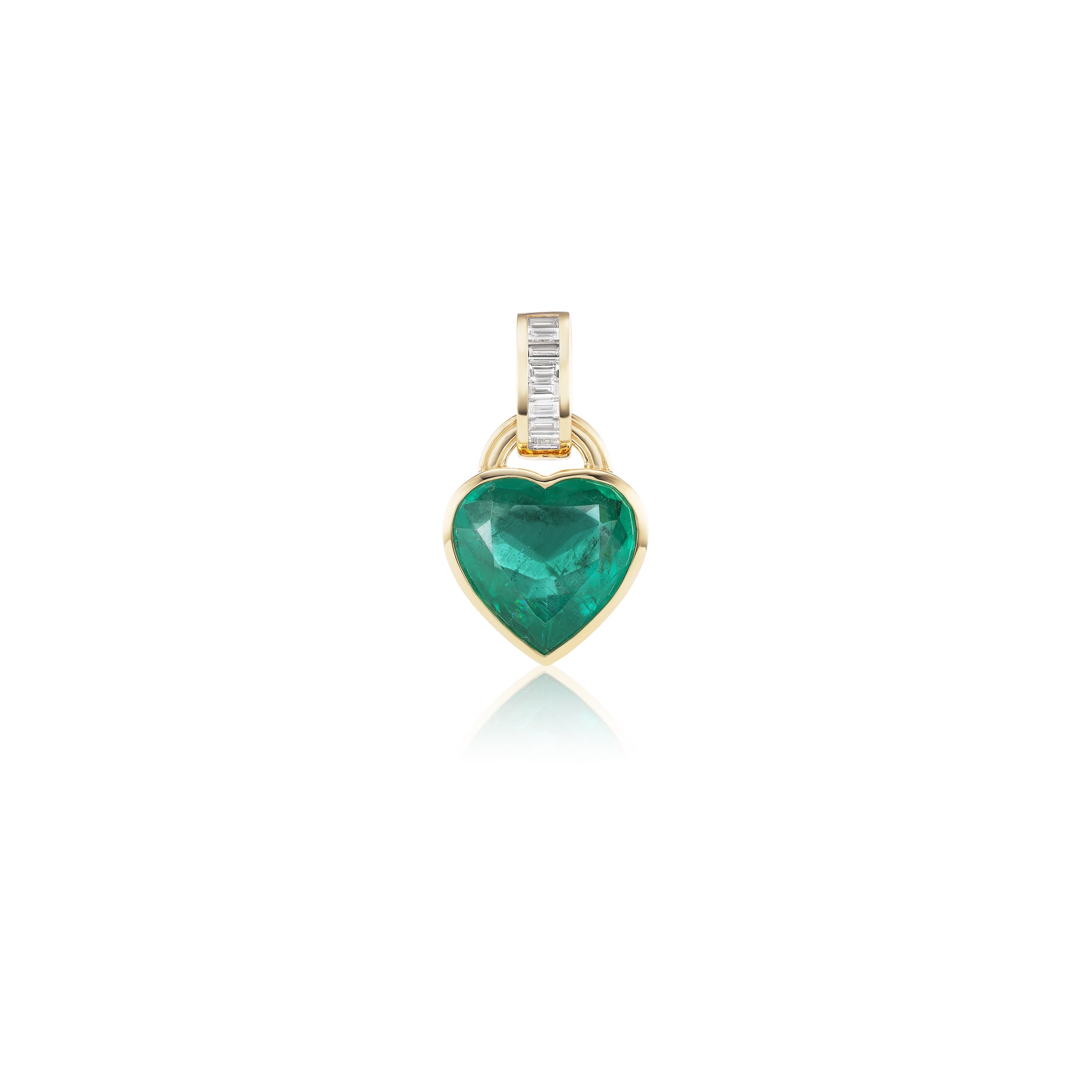 Handcrafted 18k yellow gold pendant with 2.77 ctw Brazilian emerald and 0.12 cttw G-H/SI diamonds. 15 mm x 11 mm.