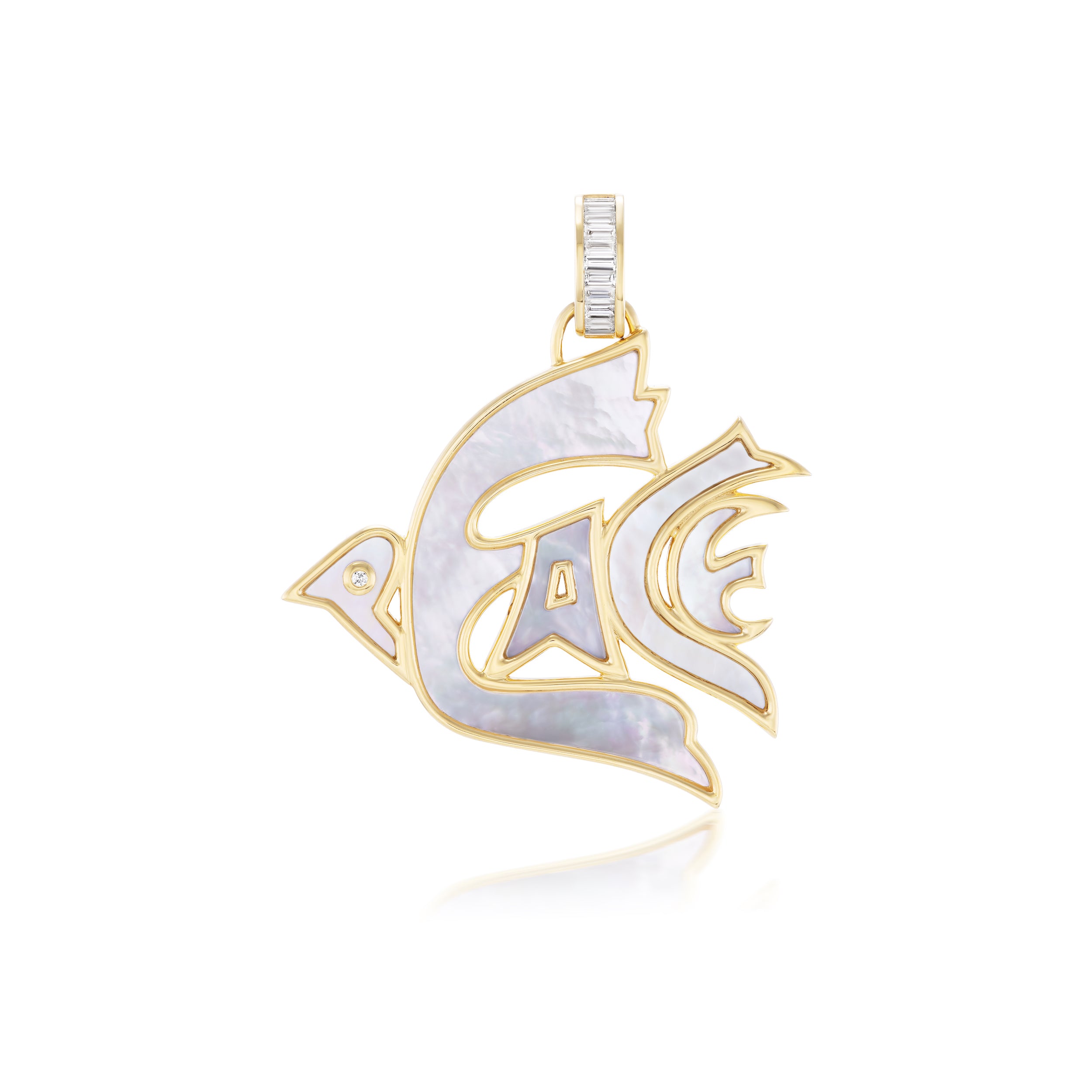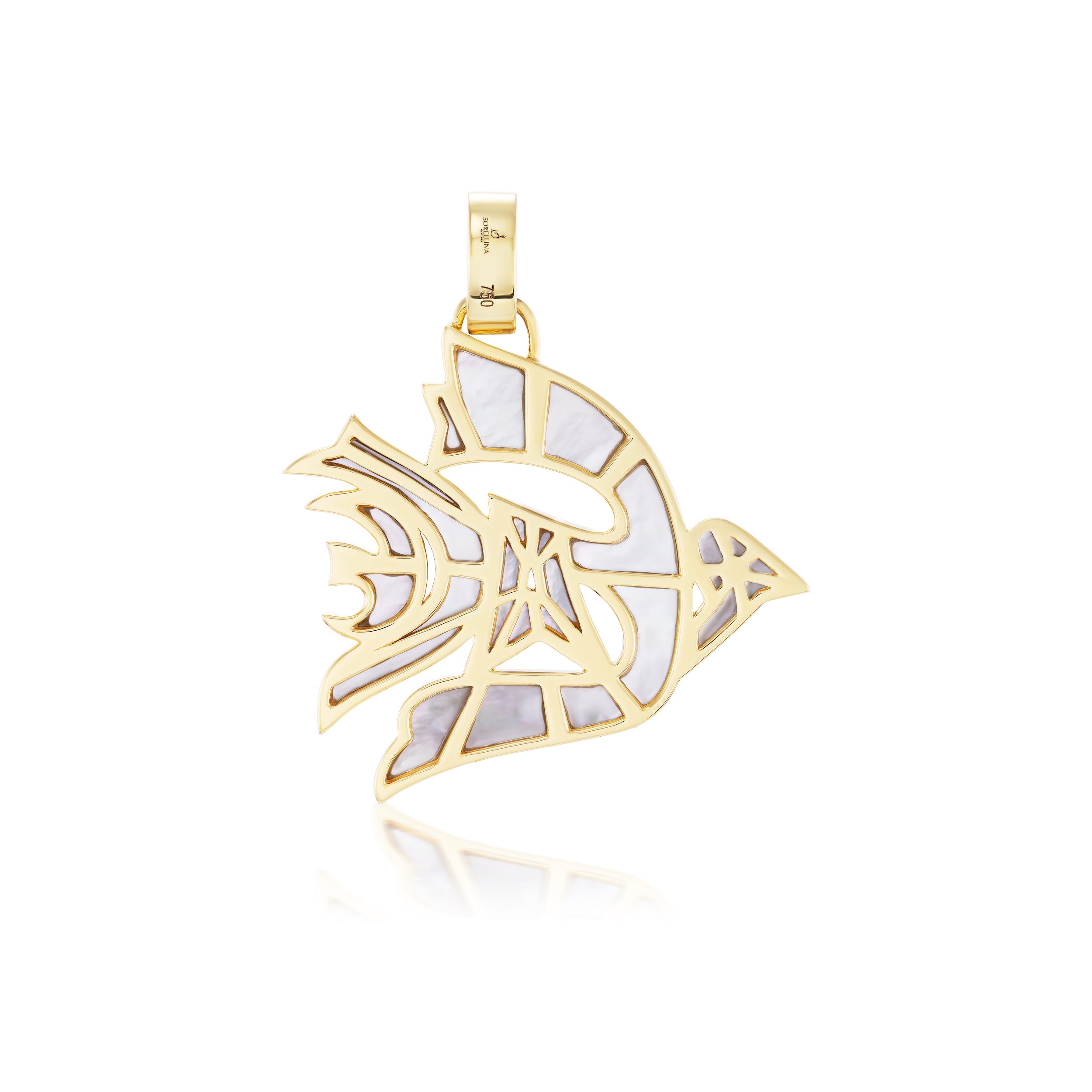 Handcrafted 18k yellow gold pendant with 4.35 cttw carved mother of pearl inlay and 0.18 cttw G-H/SI diamonds. 31 mm x 28 mm. Pendant only.