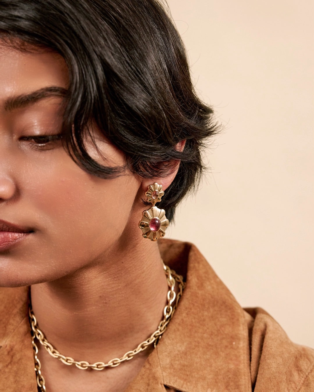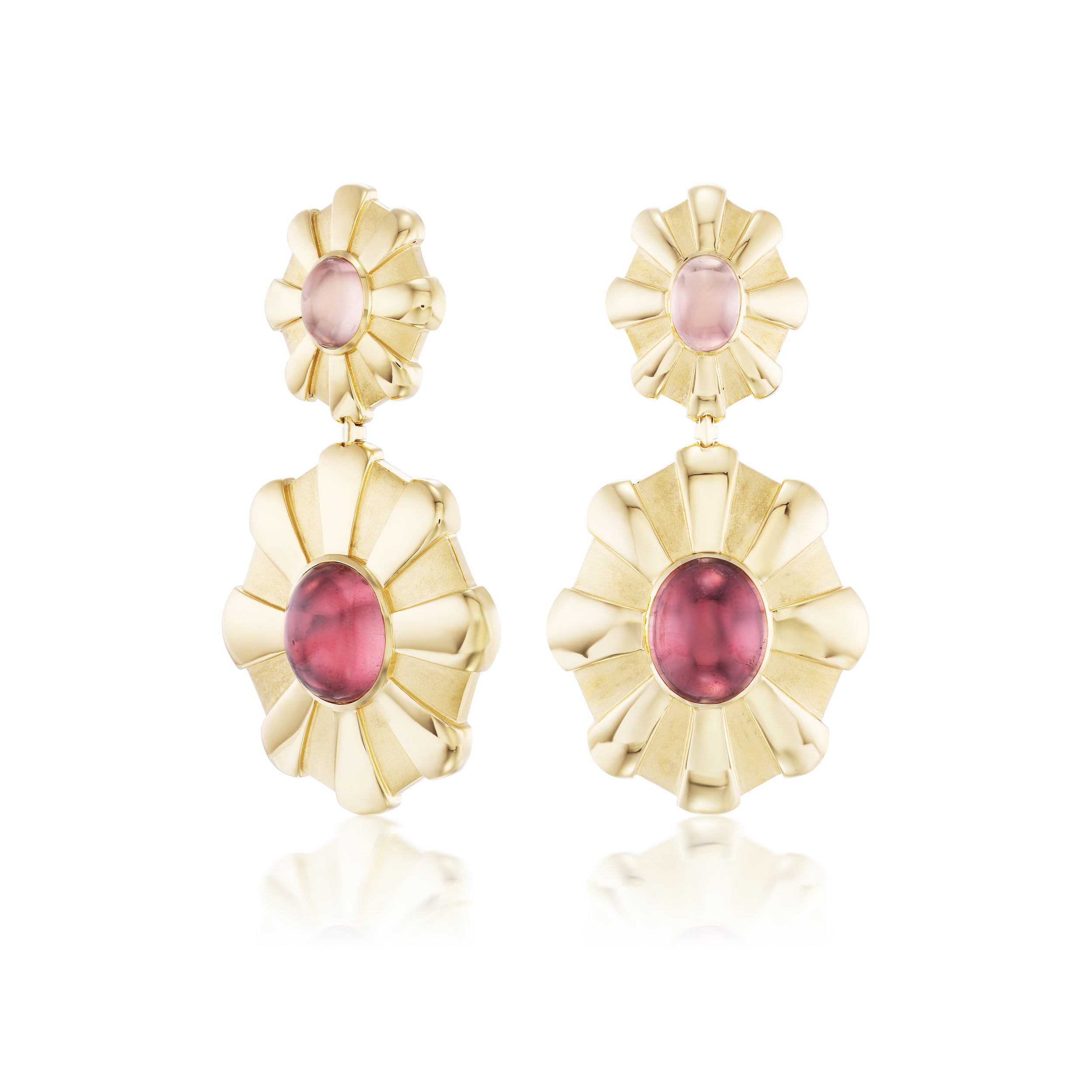 Handcrafted 18k yellow gold earrings with 9.45 cttw pink tourmaline. 47 mm x 24 mm.