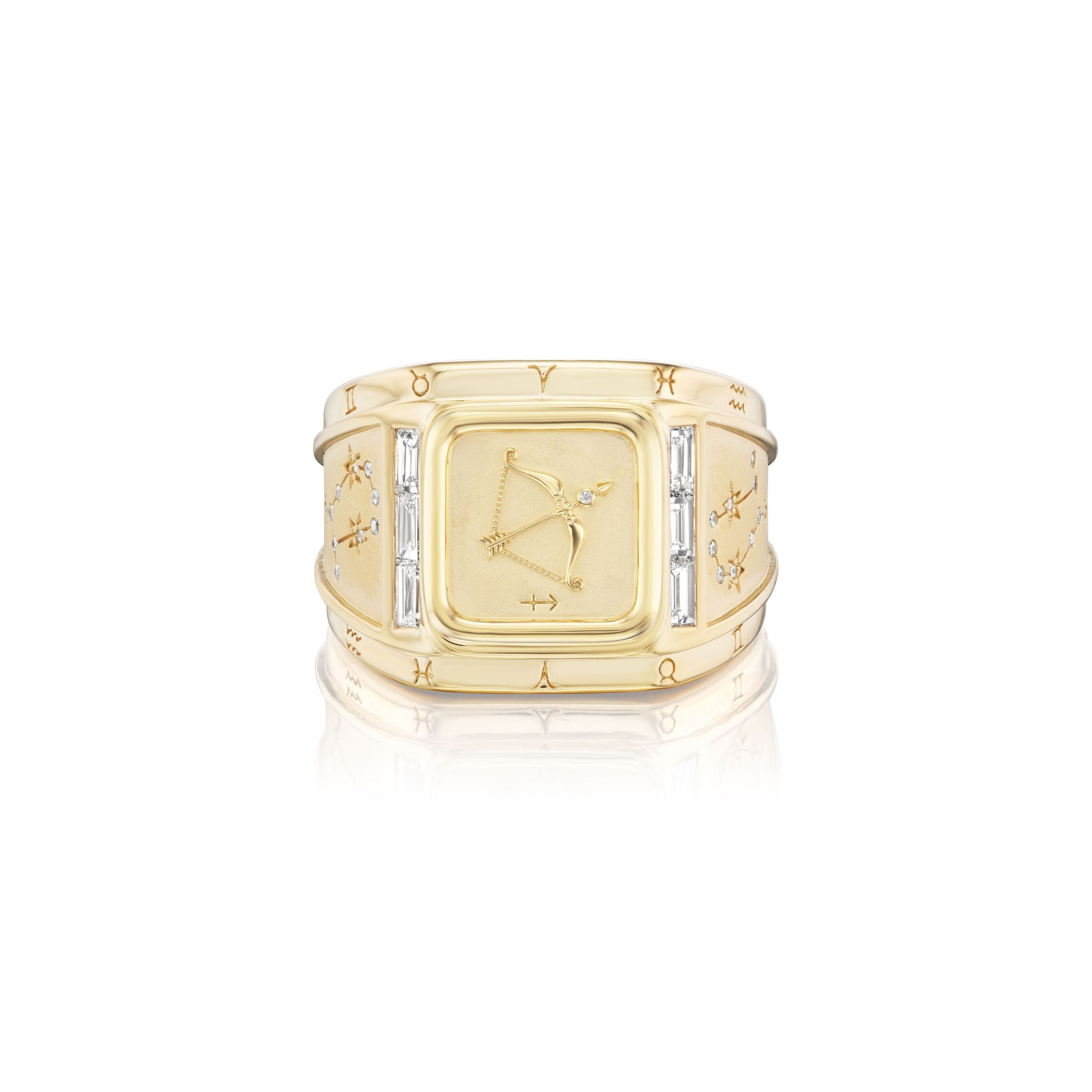 Handcrafted from 18k yellow gold with 0.35 cttw diamonds, this ring features a bow and arrow, representing the Sagittarius zodiac, pictured on the front. On the sides, the magic continues with an engraved constellation, featuring diamonds in the place of stars, offering a subtle yet captivating representation of the night sky. Around the border, all twelve zodiacs are represented, creating a complete cosmic narrative. This personal talisman invites you to carry both your astrological identity and the cosmic forces that shape your destiny.