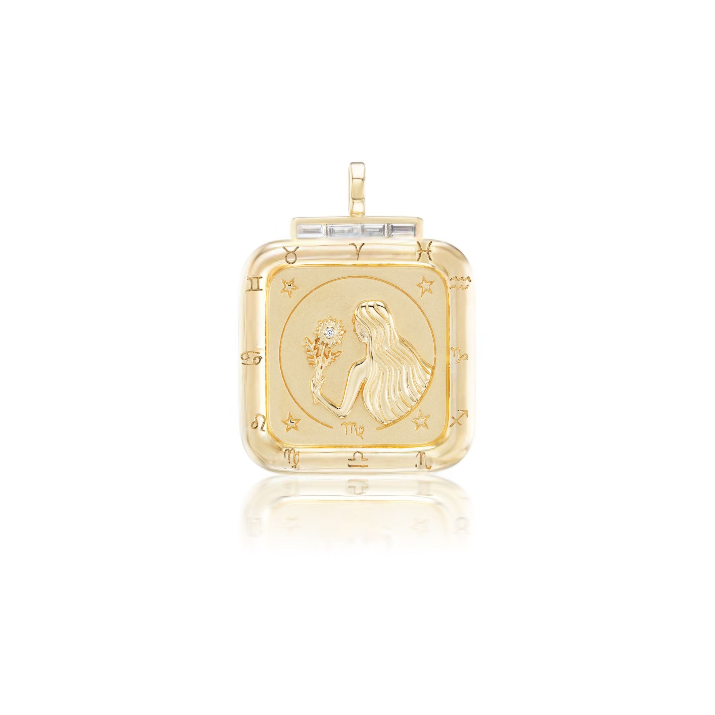 Handcrafted in 18k yellow gold with 0.24 cttw G-H/SI diamonds, this pendant features the goddess of wheat and agriculture, representing the Virgo zodiac, pictured on the front. On the reverse, the magic continues with an engraved constellation, featuring diamonds in the place of stars, offering a subtle yet captivating representation of the night sky. This personal talisman invites you to carry both your astrological identity and the cosmic forces that shape your destiny.