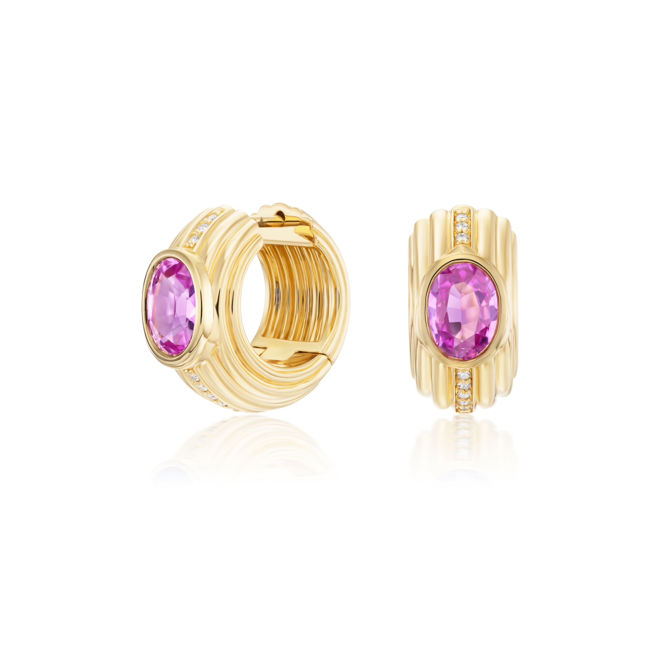 Handcrafted 18k yellow gold huggie earrings with 1.68 cttw oval pink sapphire and 0.07 cttw diamonds. 15 x 7.5 mm.