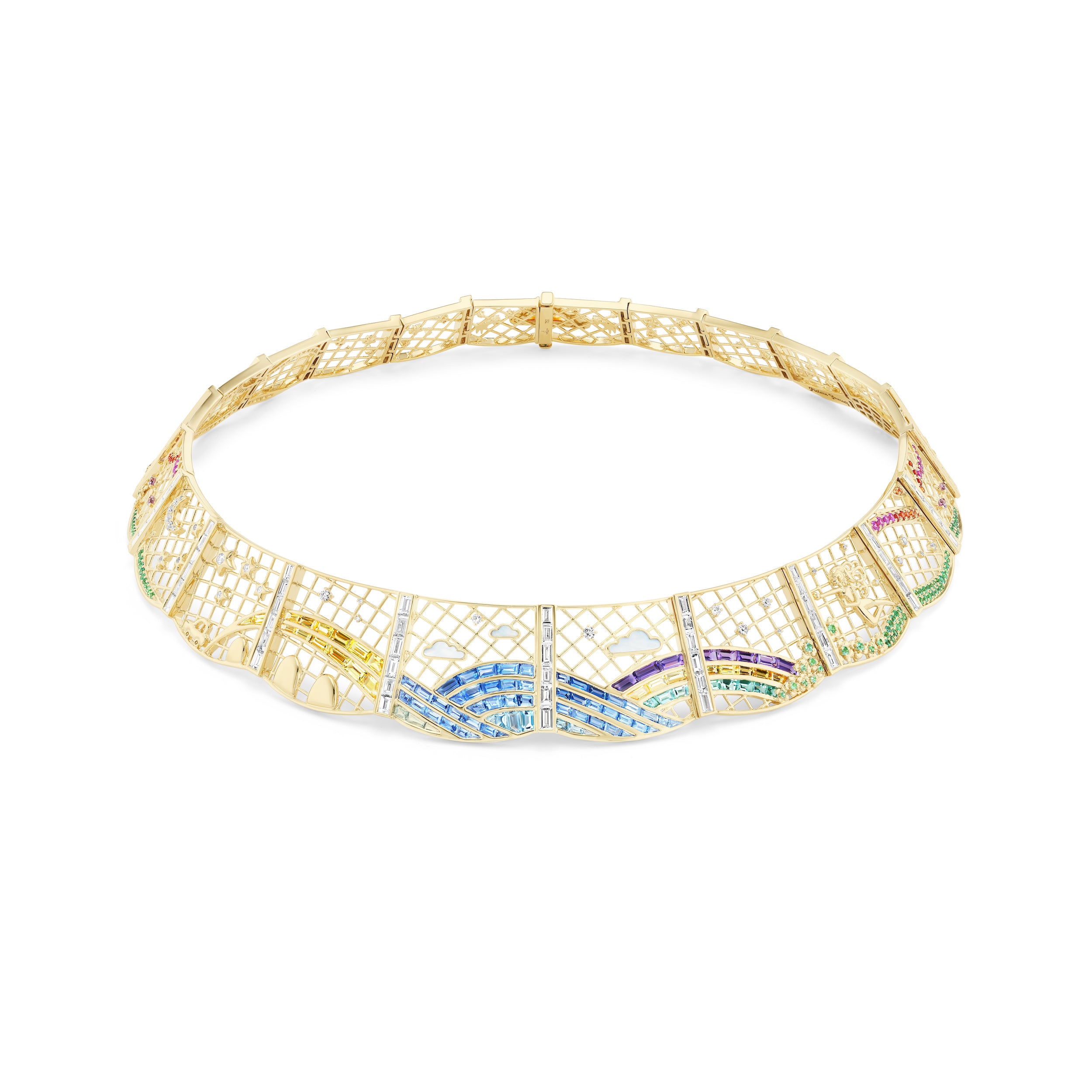 The design unfolds as a narrative, beginning with a boat on a river, followed by tangerine trees and marmalade skies brought to life through orange and pink sapphires. Yellow sapphires and emeralds create the cellophane flowers, while a gold lattice forms a celestial backdrop.
