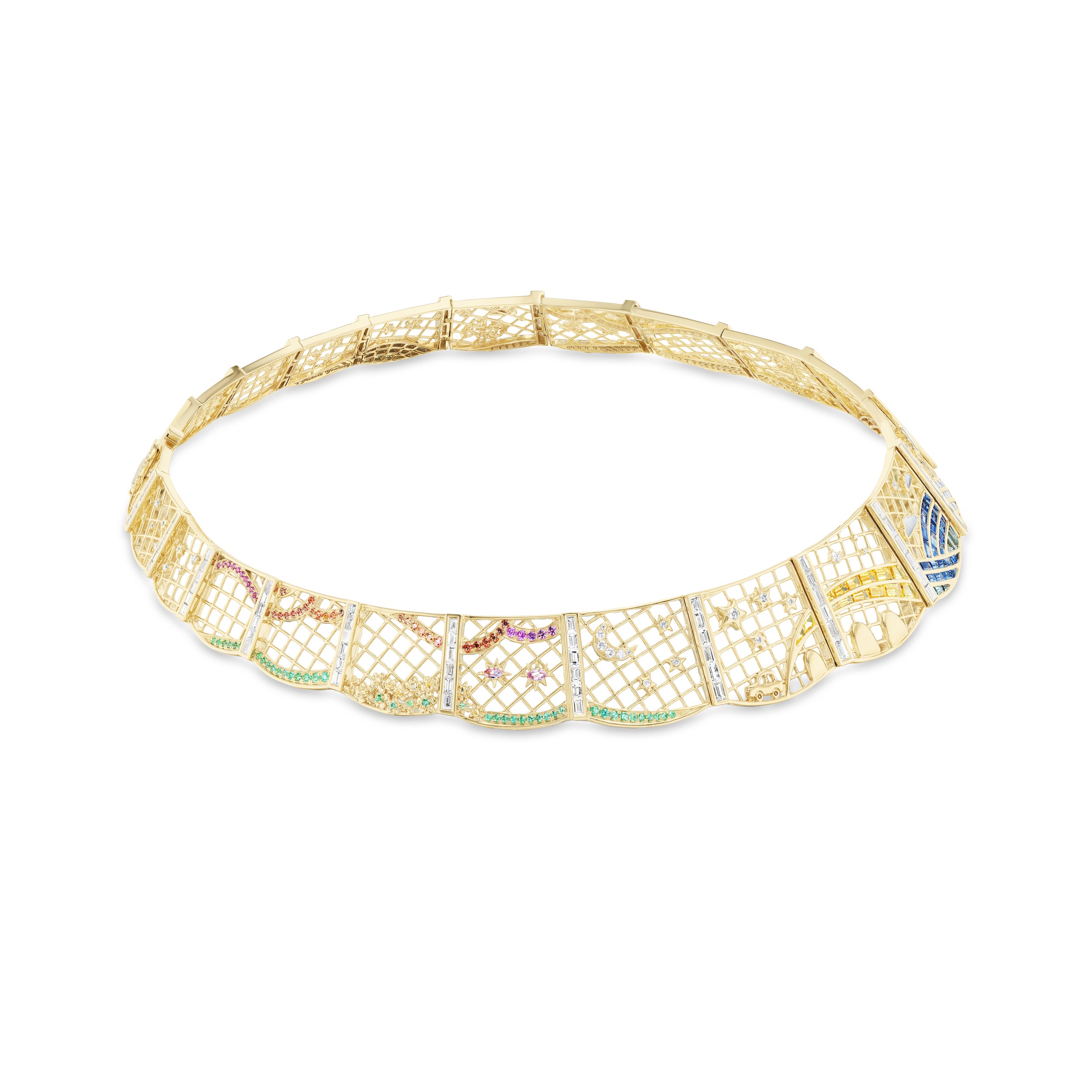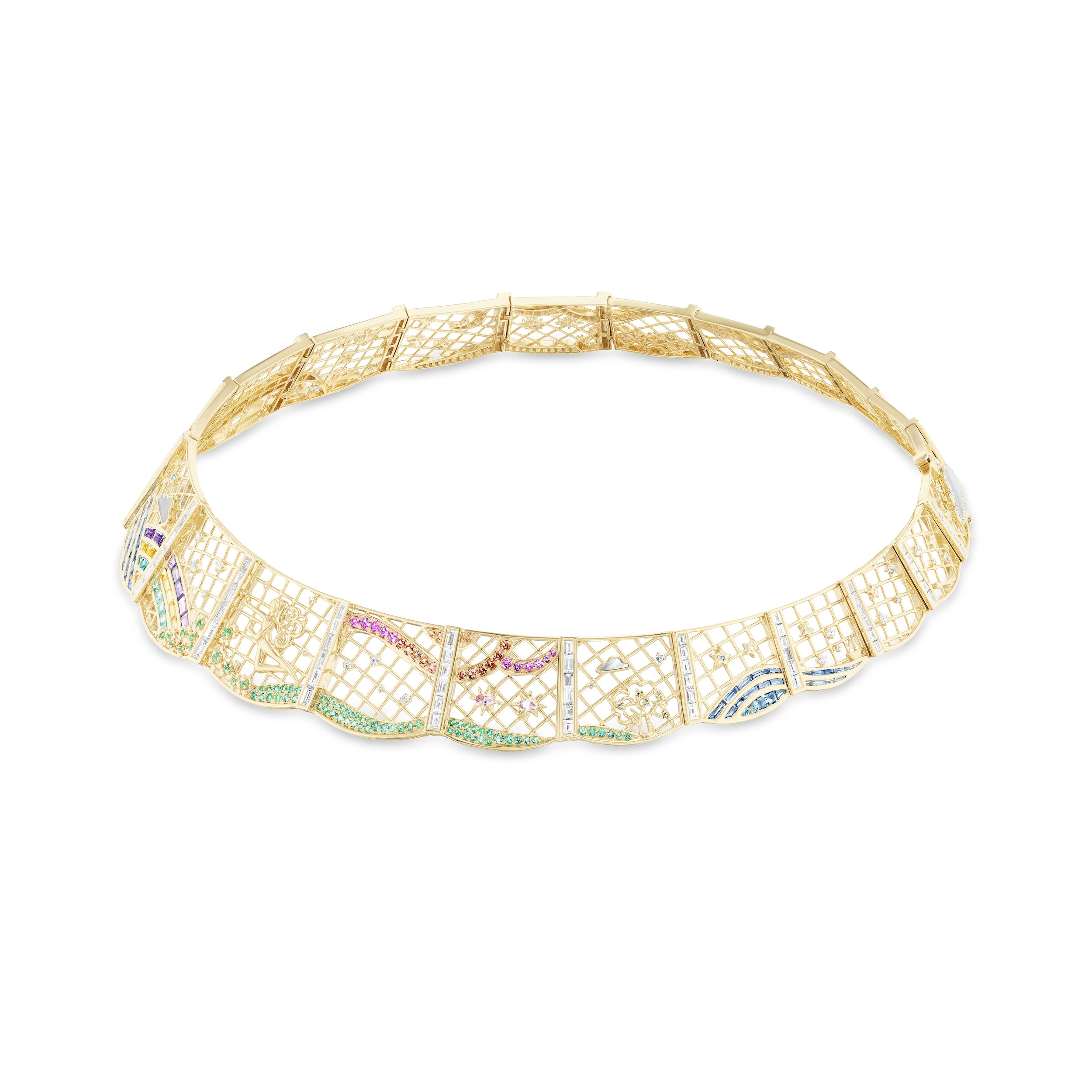 This one-of-a-kind 18K yellow gold necklace creates a visual journey through the dreamlike landscape of the iconic Beatles song Lucy in the Sky with Diamonds. Each meticulously crafted panel tells a chapter of Lucy's psychedelic adventure through carefully selected  and custom cut colored gemstones.