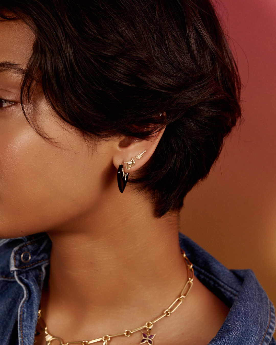 Awaken your inner rockstar with these handcrafted 18K yellow gold earrings in a guitar pick shape with carved onyx and 0.48 cttw G-H/SI diamonds. 25 mm x 20 mm