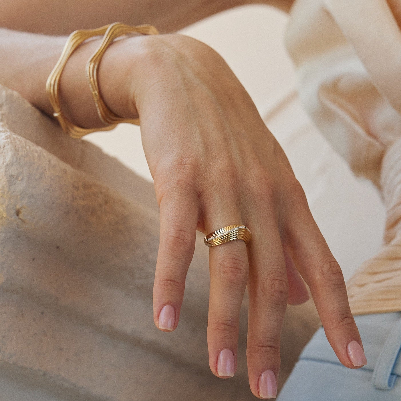 With sculptural details reminiscent of waves, this ring will transport you to a picturesque destination where electric blue water crashes against the cove-studded coastline, and the air is filled with the scent of sweet citrus.