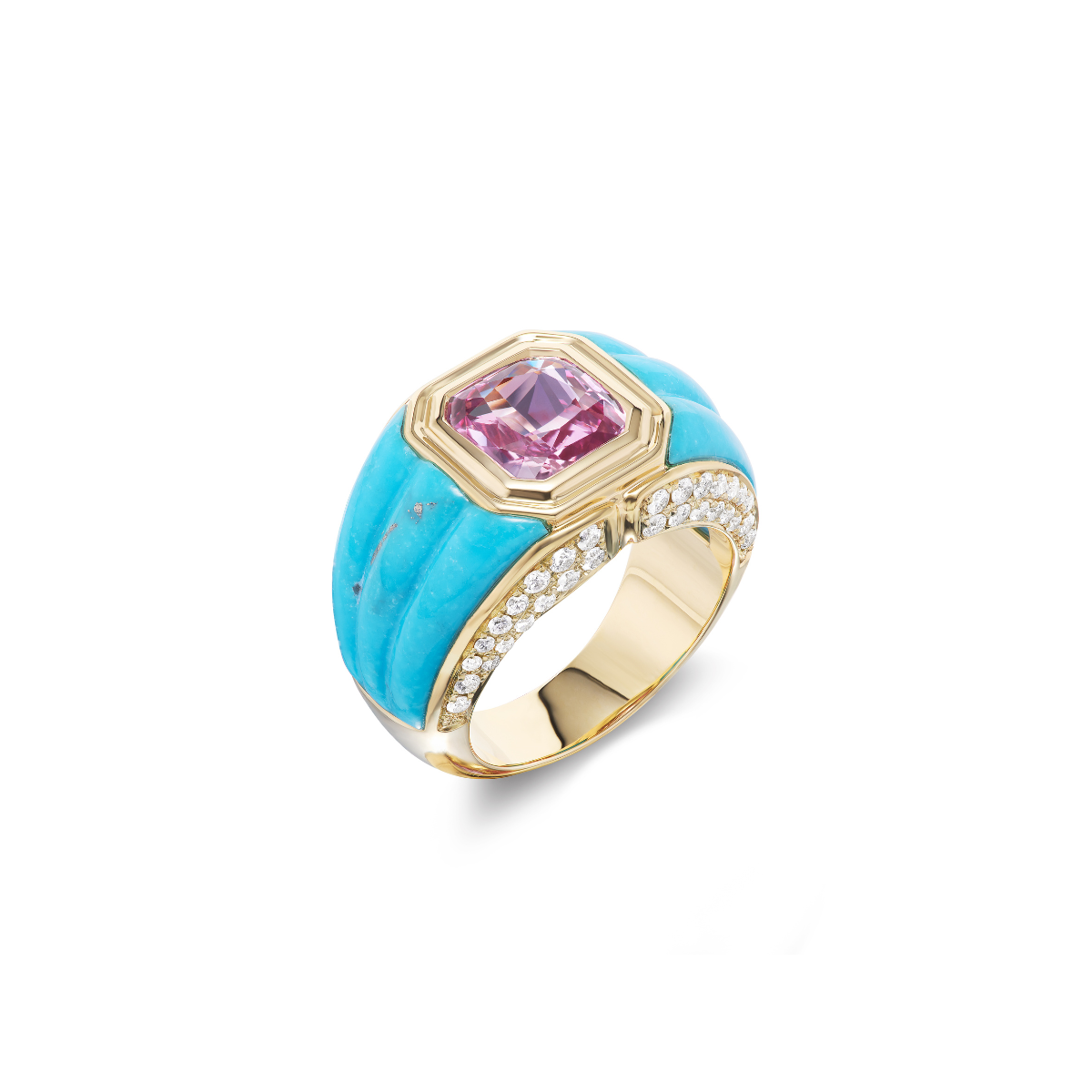 Handcrafted from 18k yellow gold, 11.61 cttw turquoise, 4.18 ctw pink sapphire, and 0.82 cttw G-HSI diamonds. Size 8.
