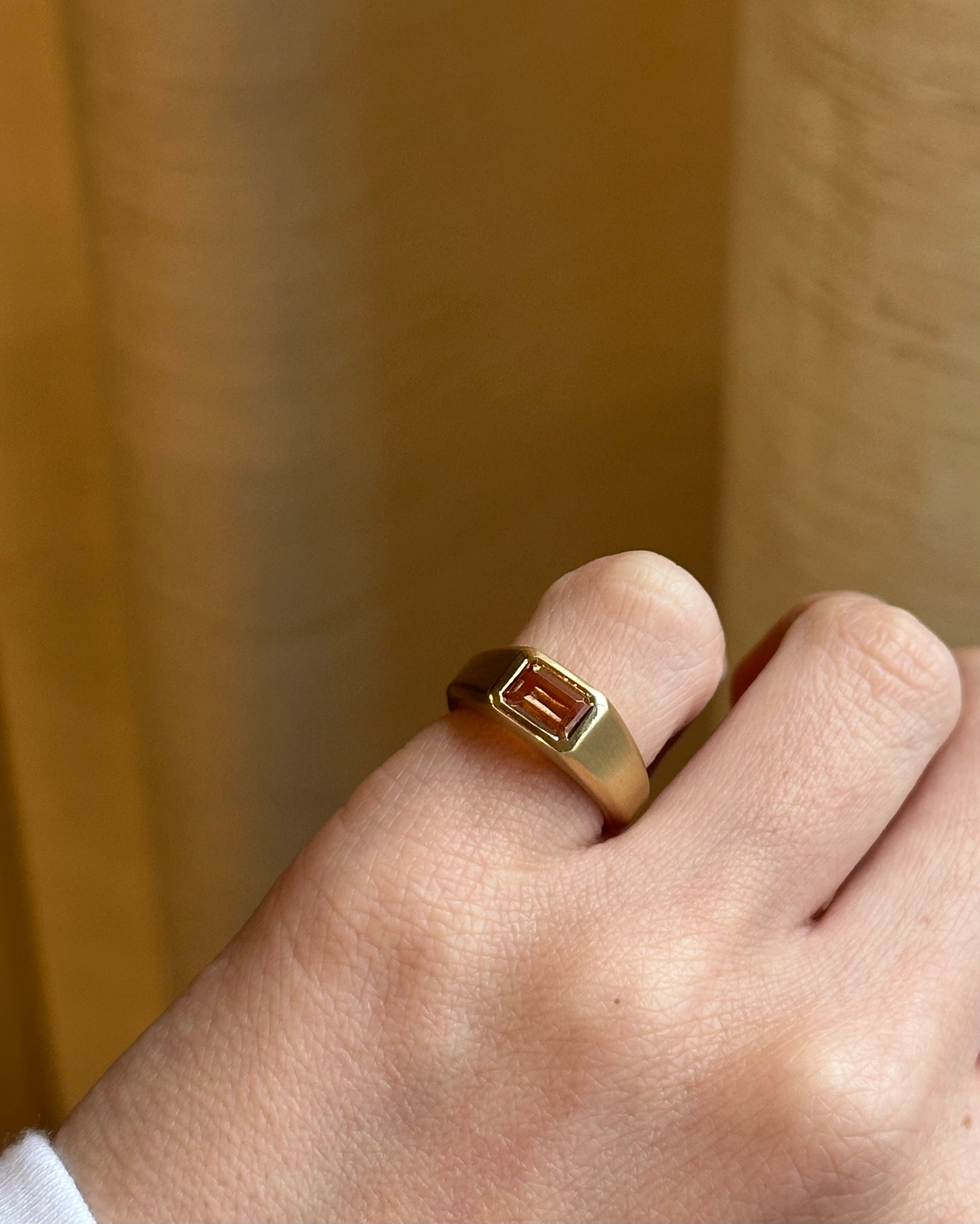 18k yellow gold ring with 1.25 ctw peach tourmaline. Brushed gold finish.