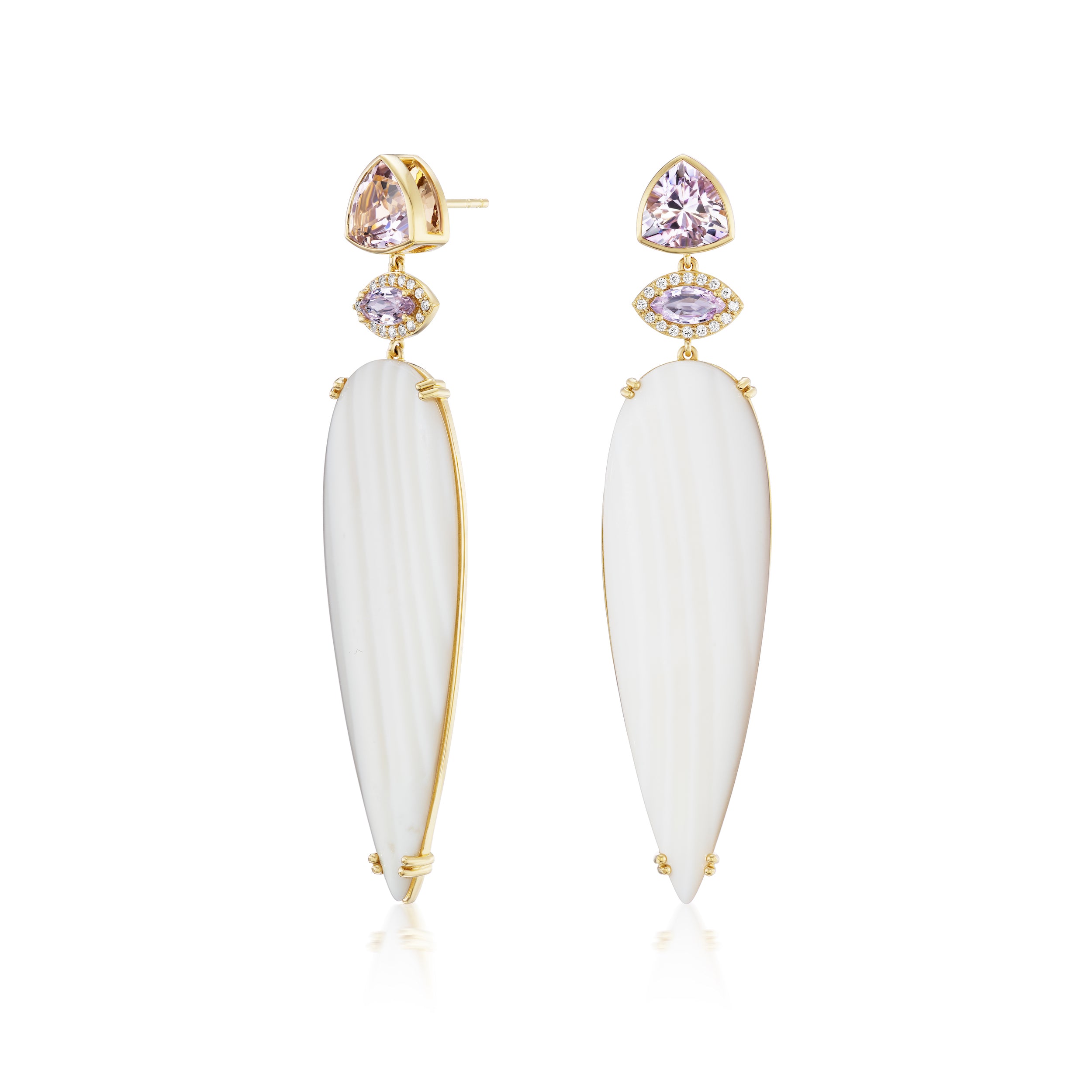 18k yellow gold earrings with 53.20 cttw chalcedony, 3.30 cttw amethyst, 0.78 cttw sapphire, and 0.16 G-HSI diamonds. Pair.