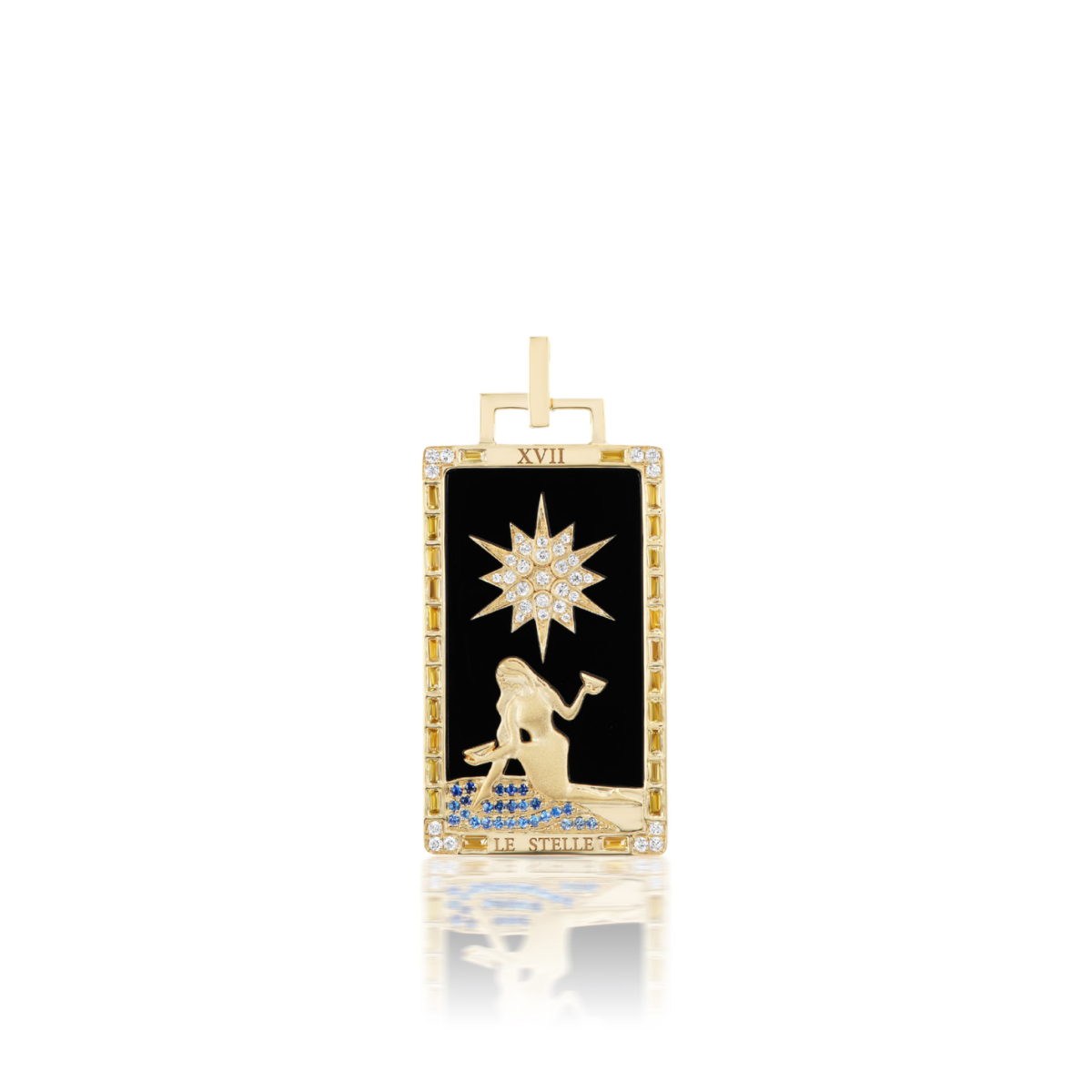 18k yellow gold pendant with 5.10 ctw onyx, 0.65 cttw yellow sapphire, 0.10 cttw blue sapphre, 0.19 cttw G-HSI diamond.