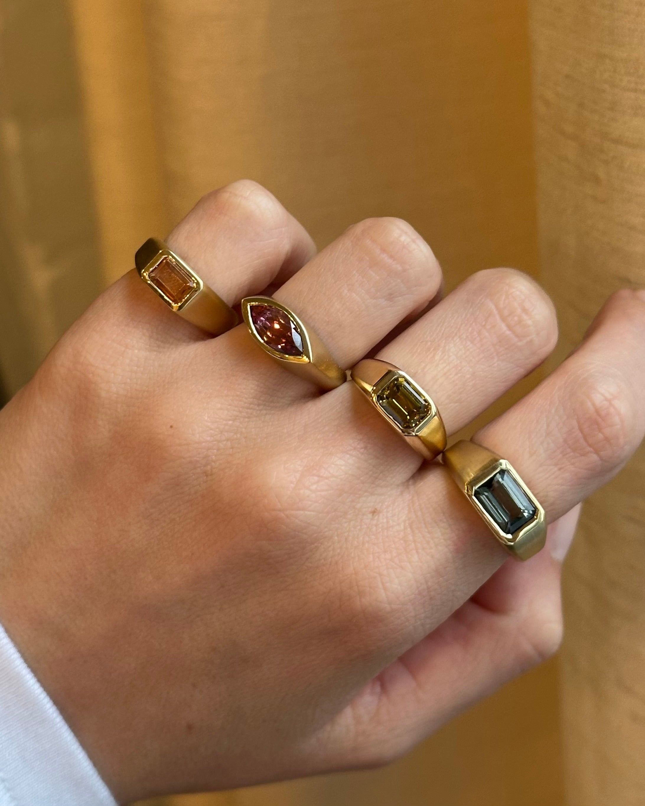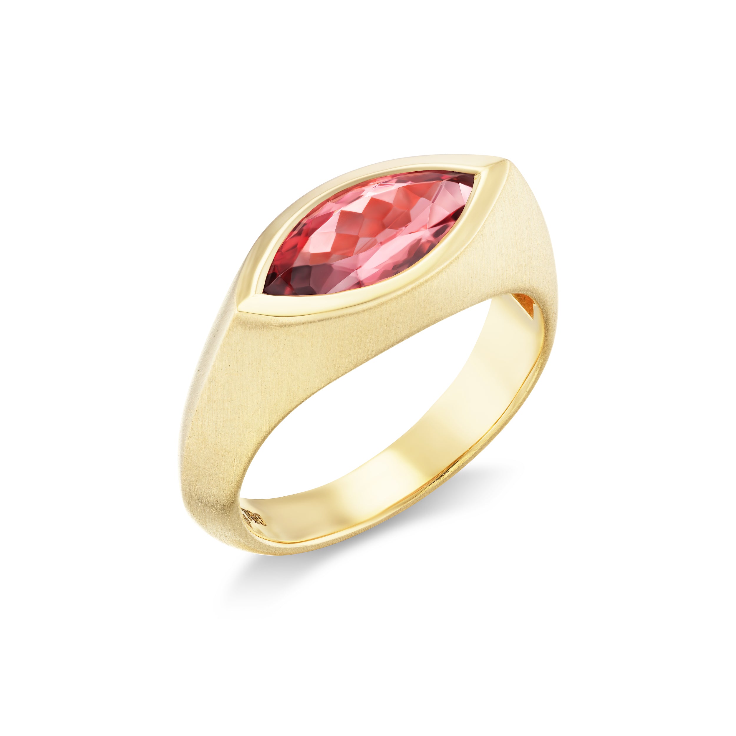18k yellow gold ring with 1.47 ctw pink tourmaline. Brushed gold finish.