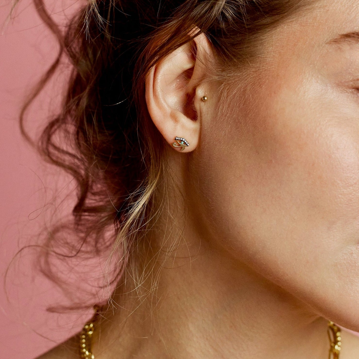 18K yellow gold stud with turquoise and black rhodium detail over G-H/SI diamonds.