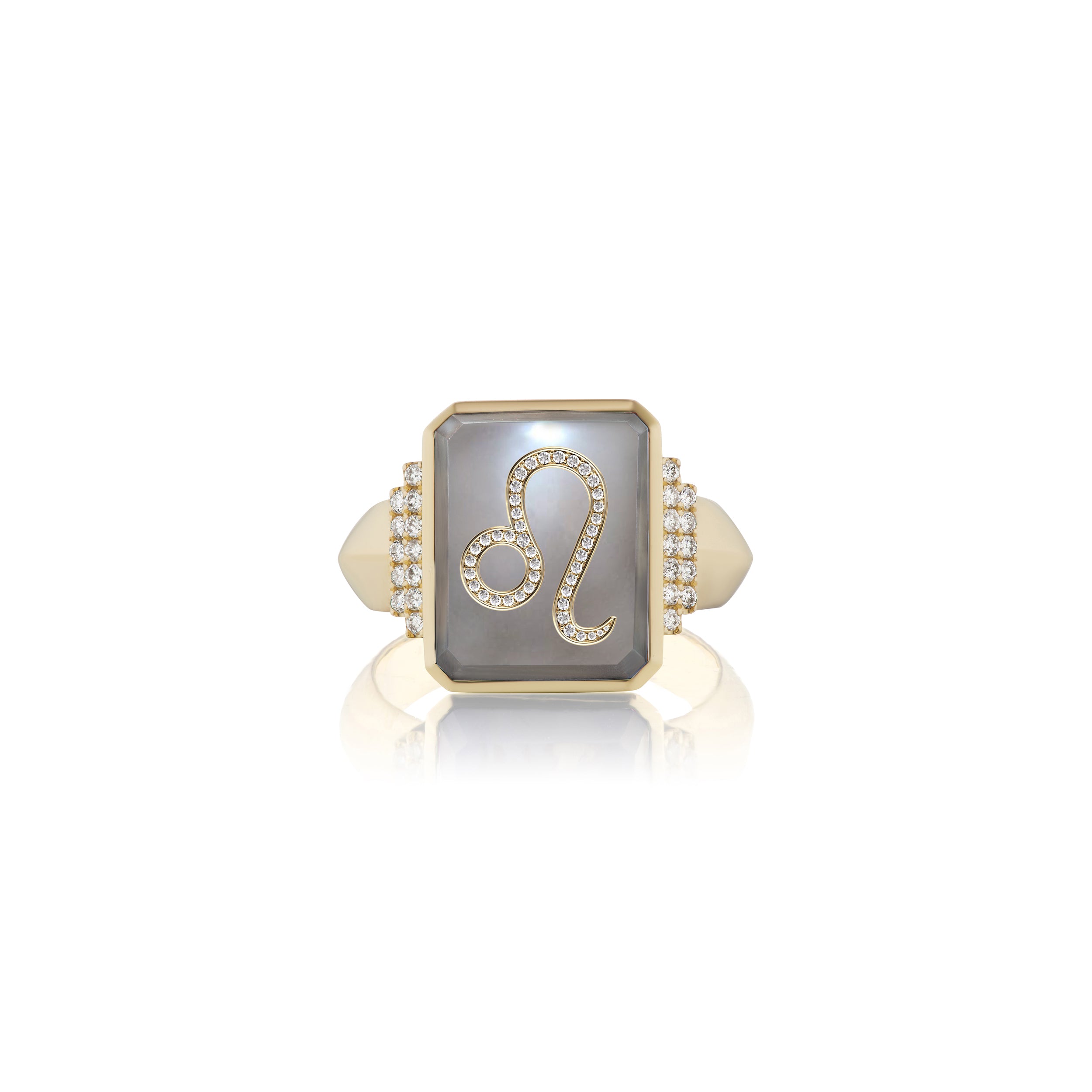 18K yellow gold signet ring with a Leo Zodiac motif on grey moonstone with 0.19 cttw diamonds. The signet ring measures at 1.5 cm x 1.2 cm and weighs approximately 8.3 grams.