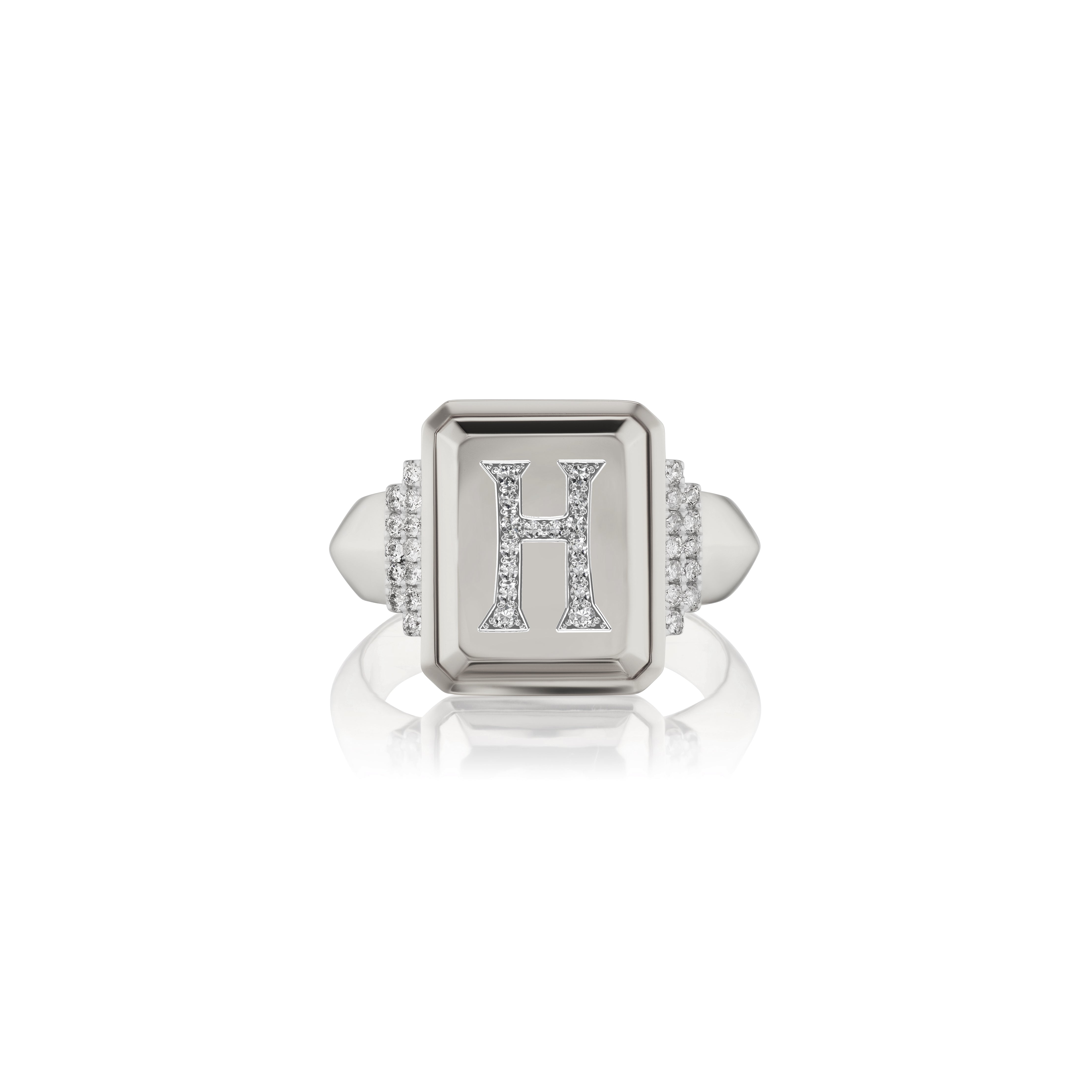 18k white gold signet ring with an H initial and diamonds. This ring measures 13 mm x 11 mm.