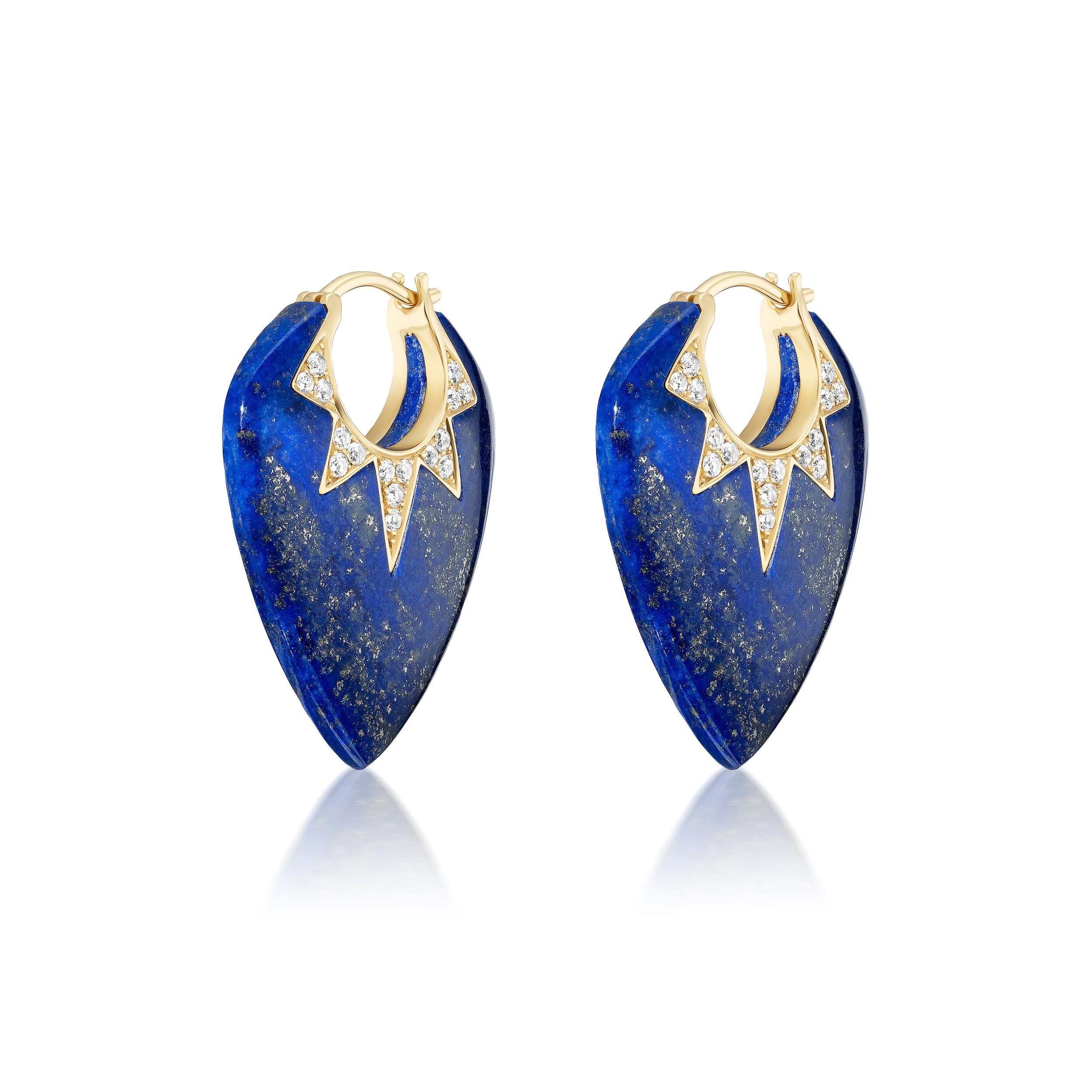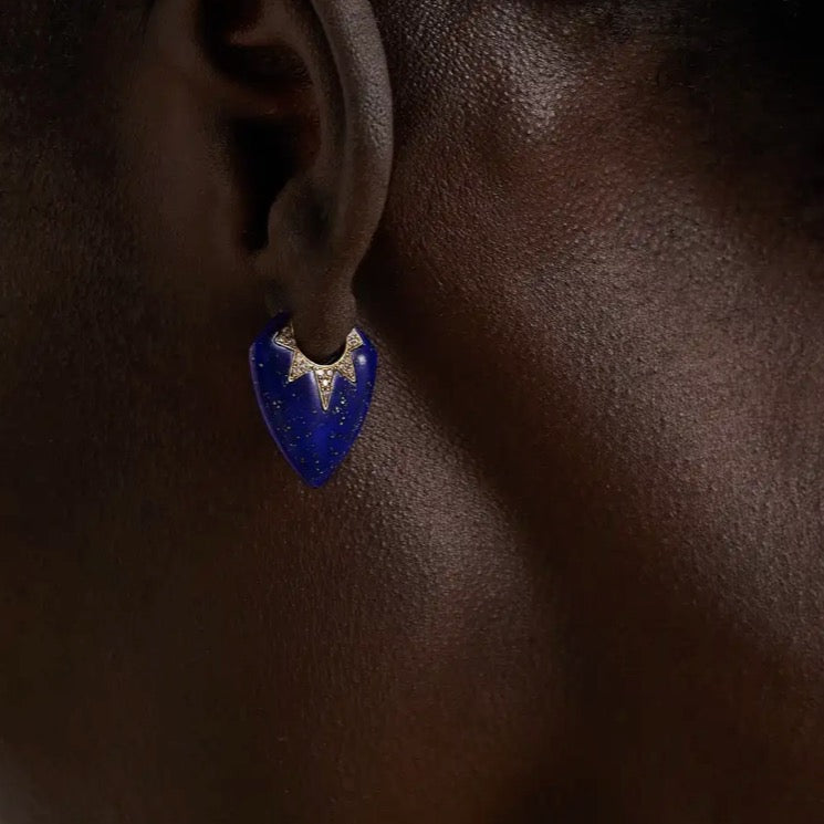 Awaken your inner rockstar with these handcrafted 18K yellow gold earrings in a guitar pick shape with carved lapis and 0.48 cttw G-H/SI diamonds. 25 mm x 20 mm