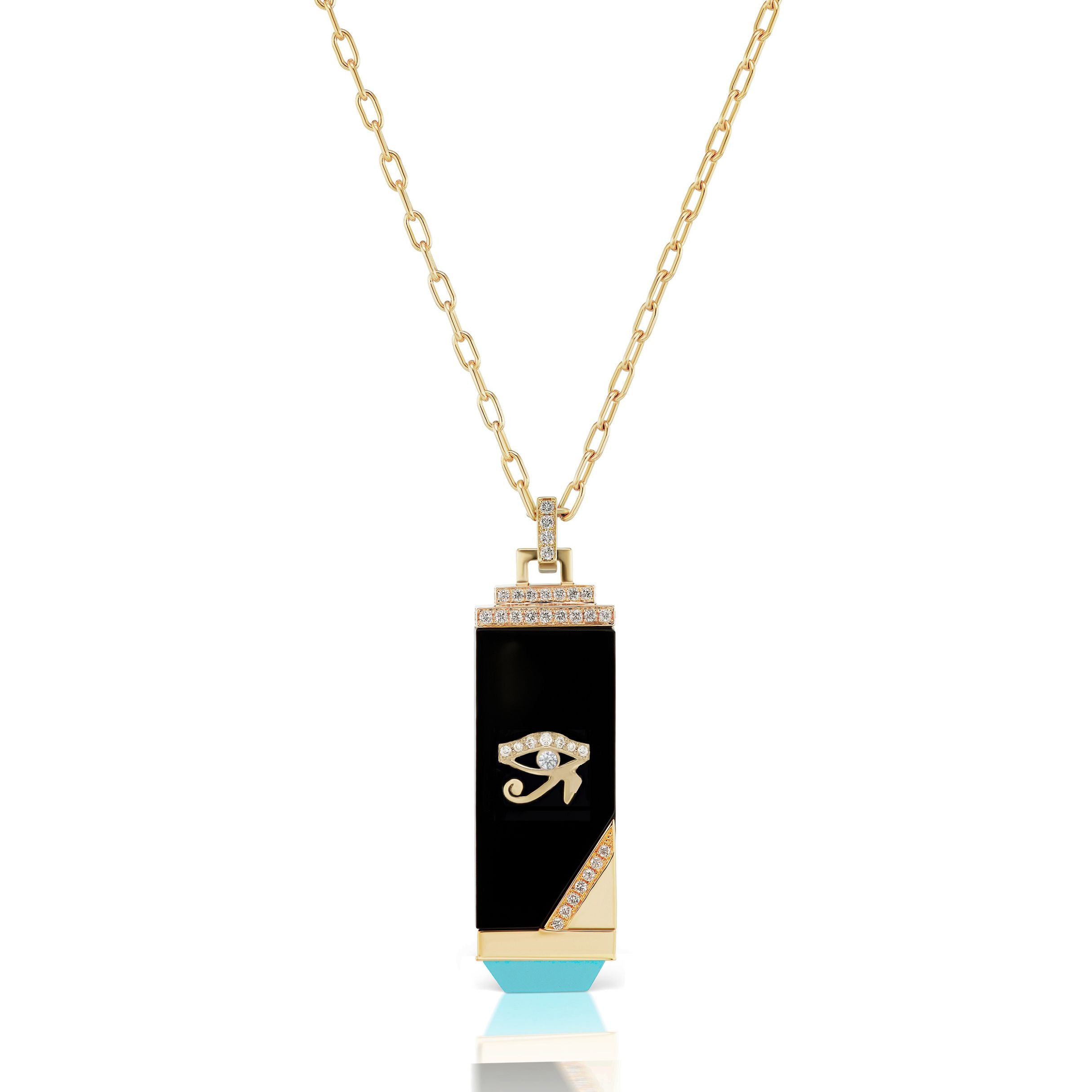 Handcrafted 18K yellow gold tablet necklace featuring an eye of Horus motif on black onyx with turquoise and 0.28 cttw G-H/SI diamonds on a 28 inch chain. The tablet measures 45mm x 15mm.