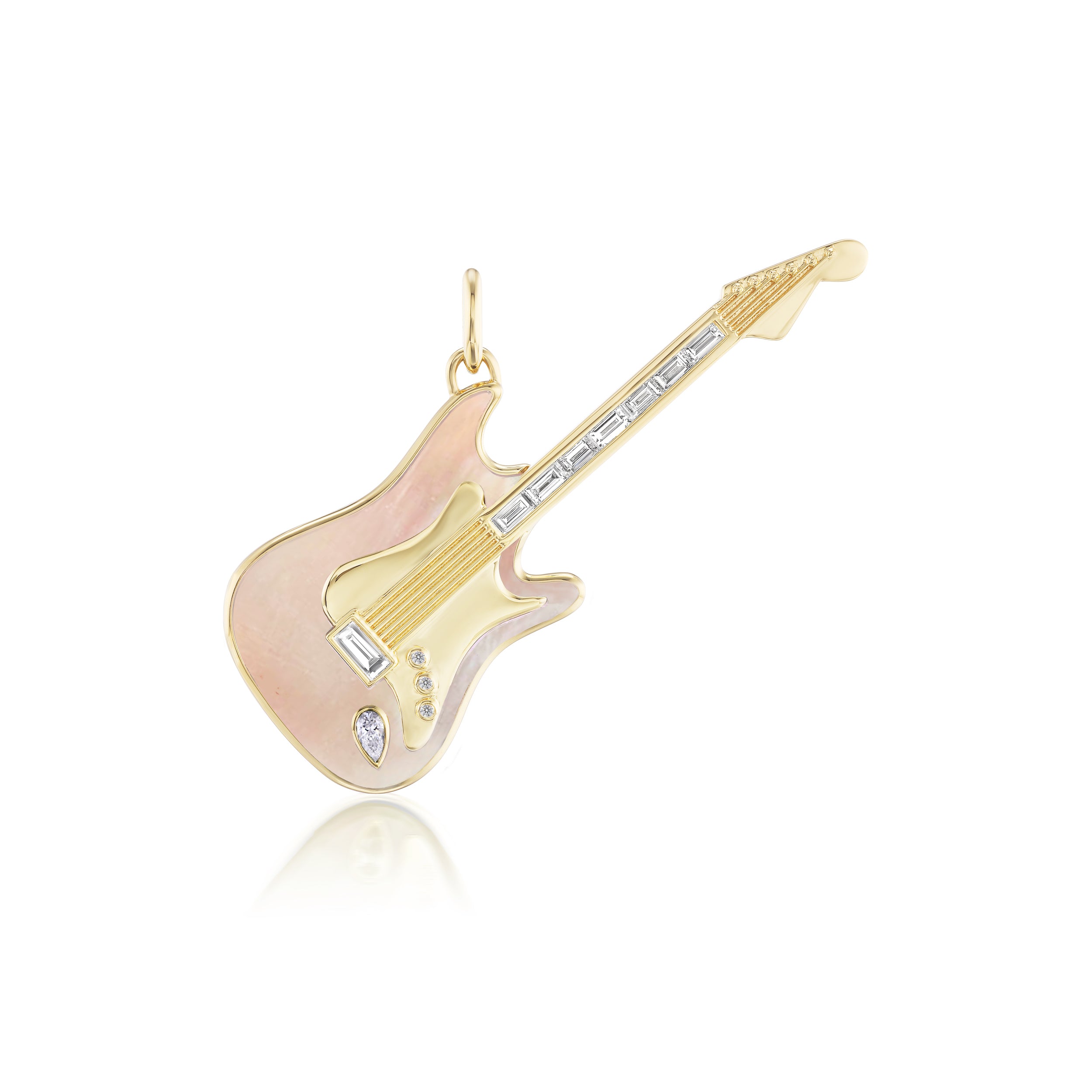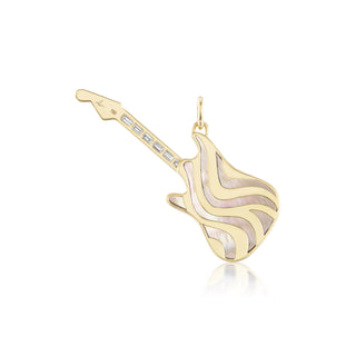 Handcrafted 18k yellow gold guitar pendant with 10.70 ctw carved pink mother of pearl inlay, 0.15 cttw sapphire, and 0.50 cttw G-H/SI diamonds. 54 mm x 20 mm. Pendant only.