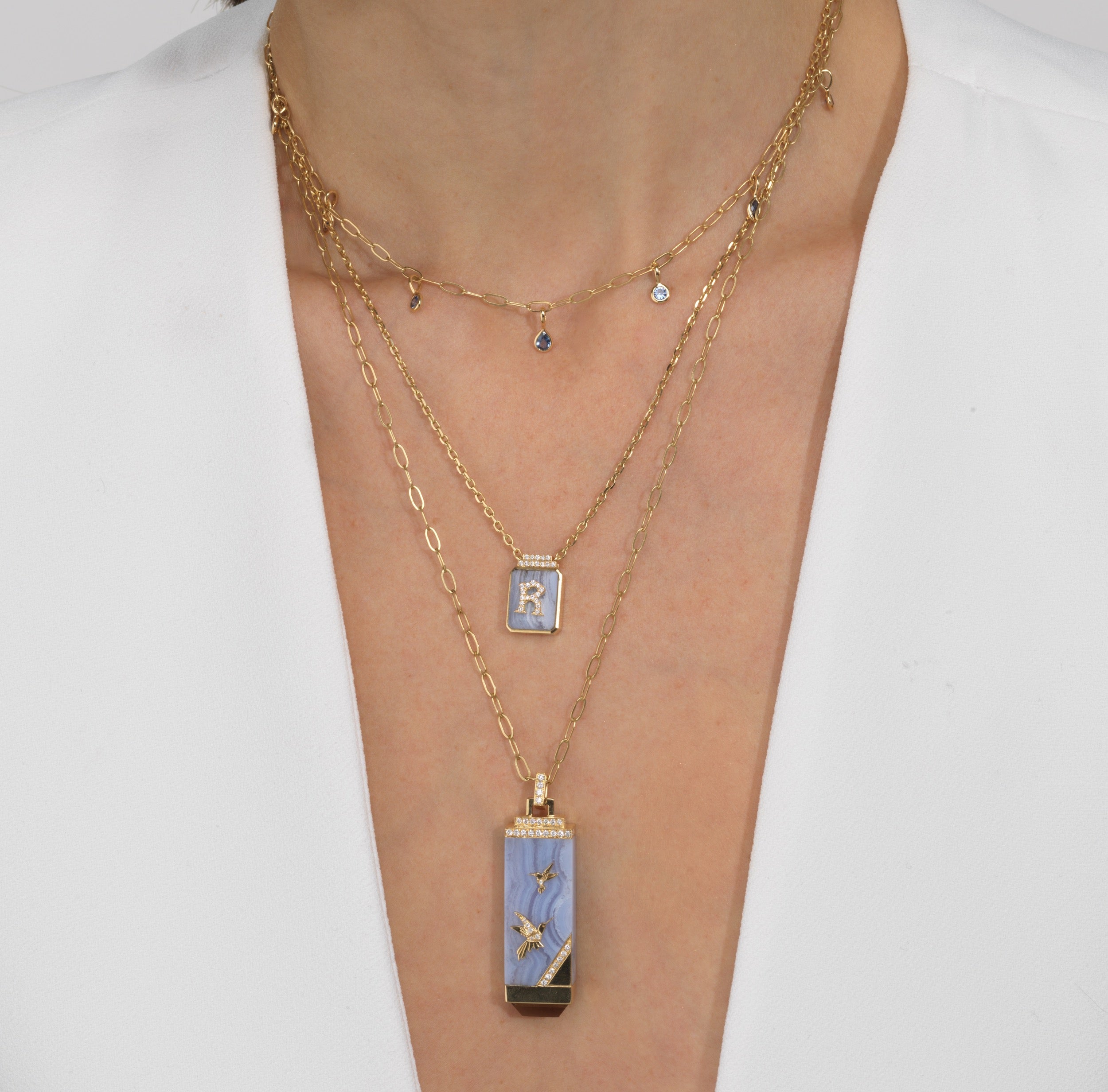 Handcrafted 18K yellow gold tablet necklace featuring hummingbird motifs on blue lace agate with smokey quartz, 0.28 cttw G-H/SI diamonds, and black rhodium detail on a 28-inch chain. The tablet measures 45mm x 15mm.