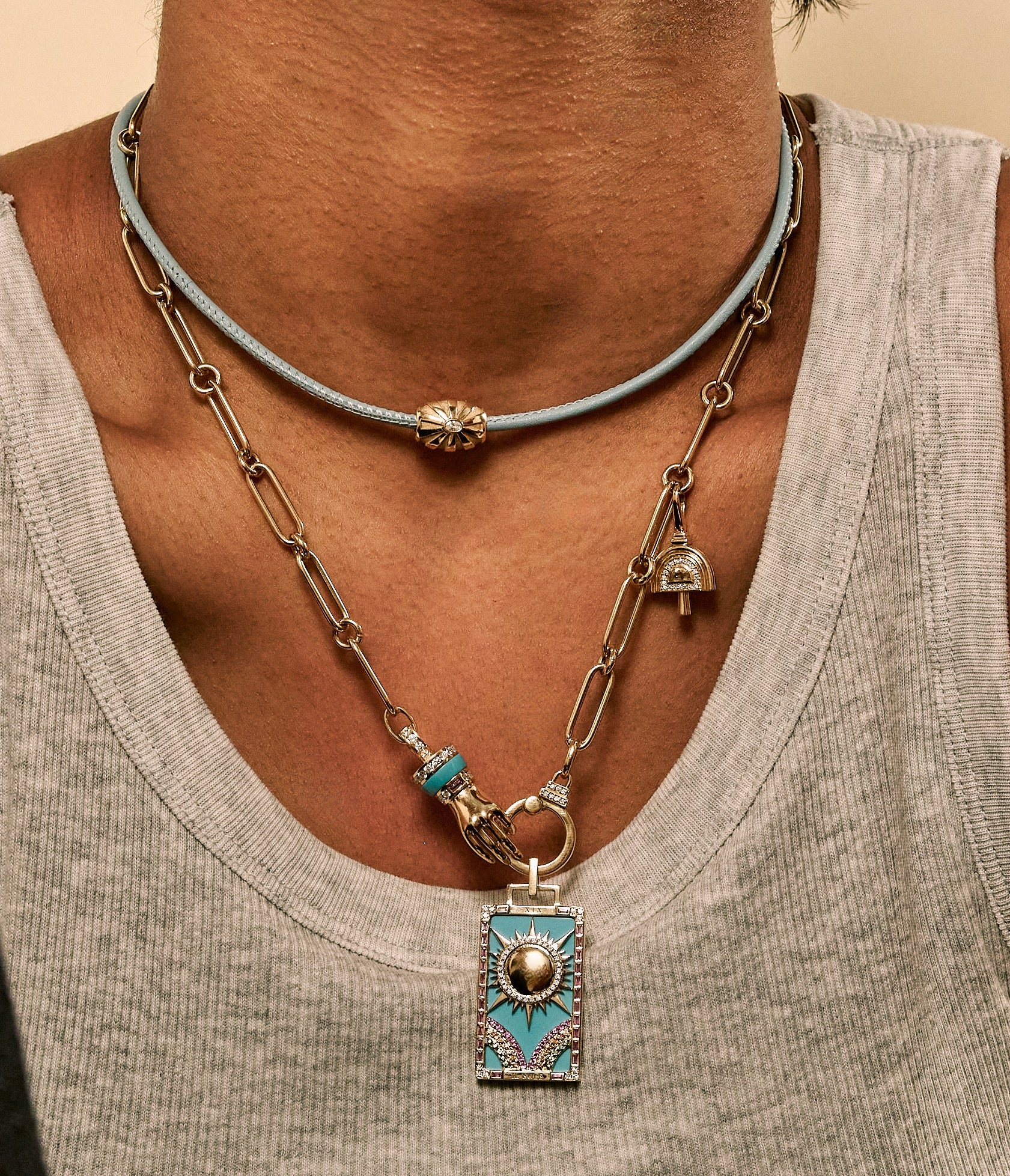 18k yellow gold pendant with 4.19 ctw turquoise, 0.74 cttw pink sapphire, 0.12 cttw orange sapphire, 0.07 cttw tsavorite, 0.25 cttw G-HSI diamonds. This pendant is 32 mm x 19 mm and comes on an 18-inch ball chain. Please see secondary model shot for size reference.