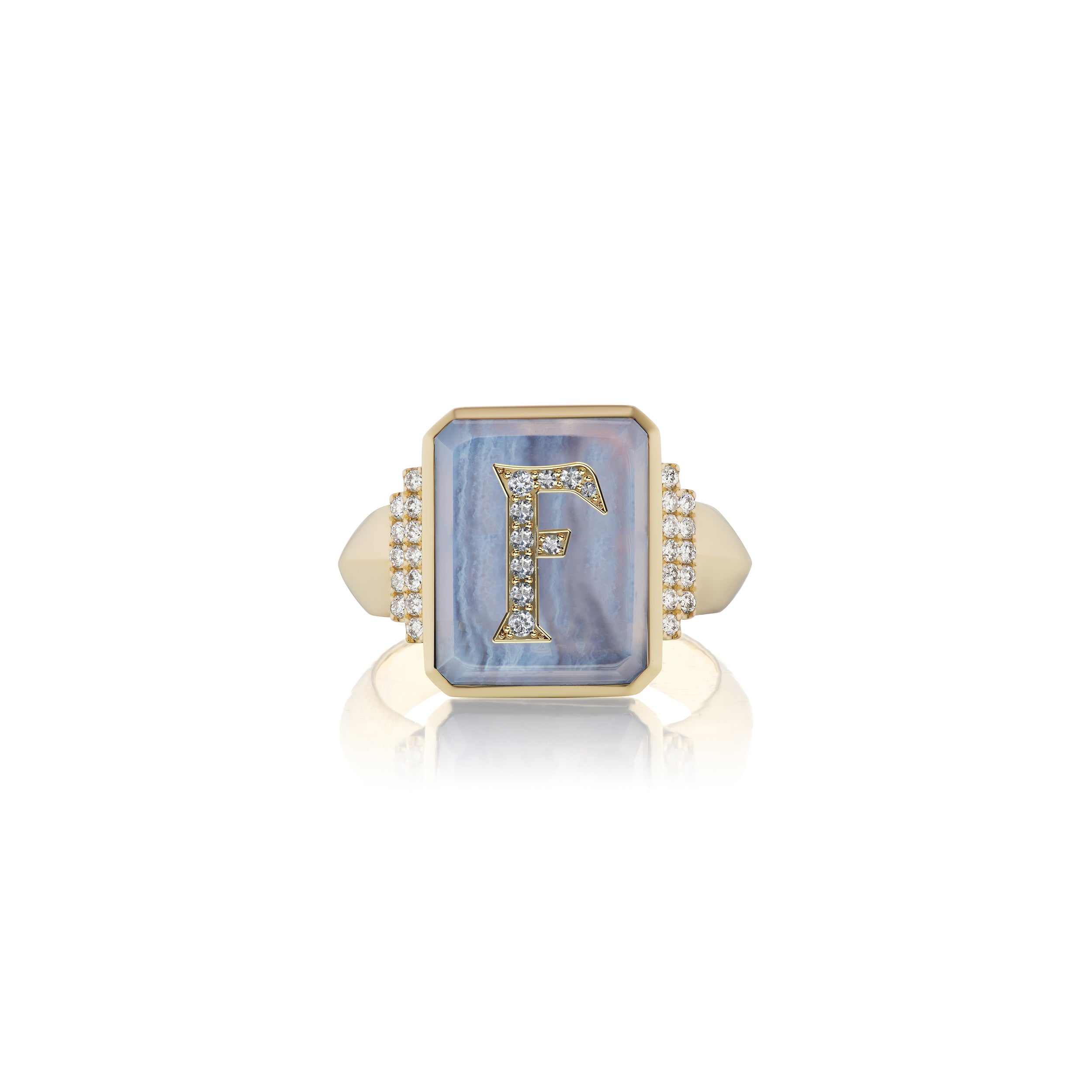 18K yellow gold signet ring with an F initial on blue lace agate with 0.19 cttw diamonds. The signet ring measures at 1.5 cm x 1.2 cm and weighs approximately 8.3 grams.